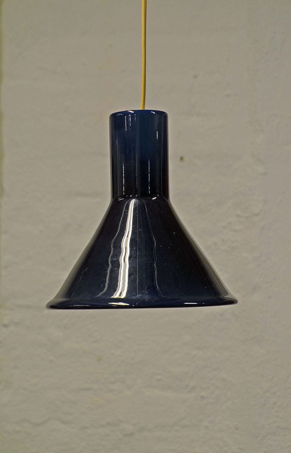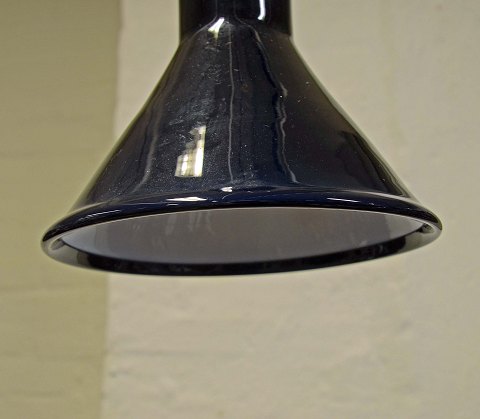 Den mere sjældne loftspendeller (nr. 18) fra Holmegaard model "Mini P&T pendel" i blåt glas.Loftslamperne er i 3 lags glas i en hvid og dyb marineblå farvenuance. Lamperne er i perfekt stand.