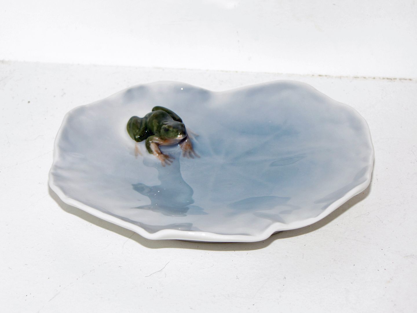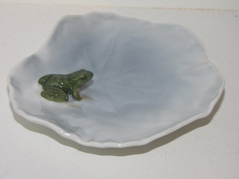 Royal Copenhagen lille skål i form af åkande med figur af grøn frø.
