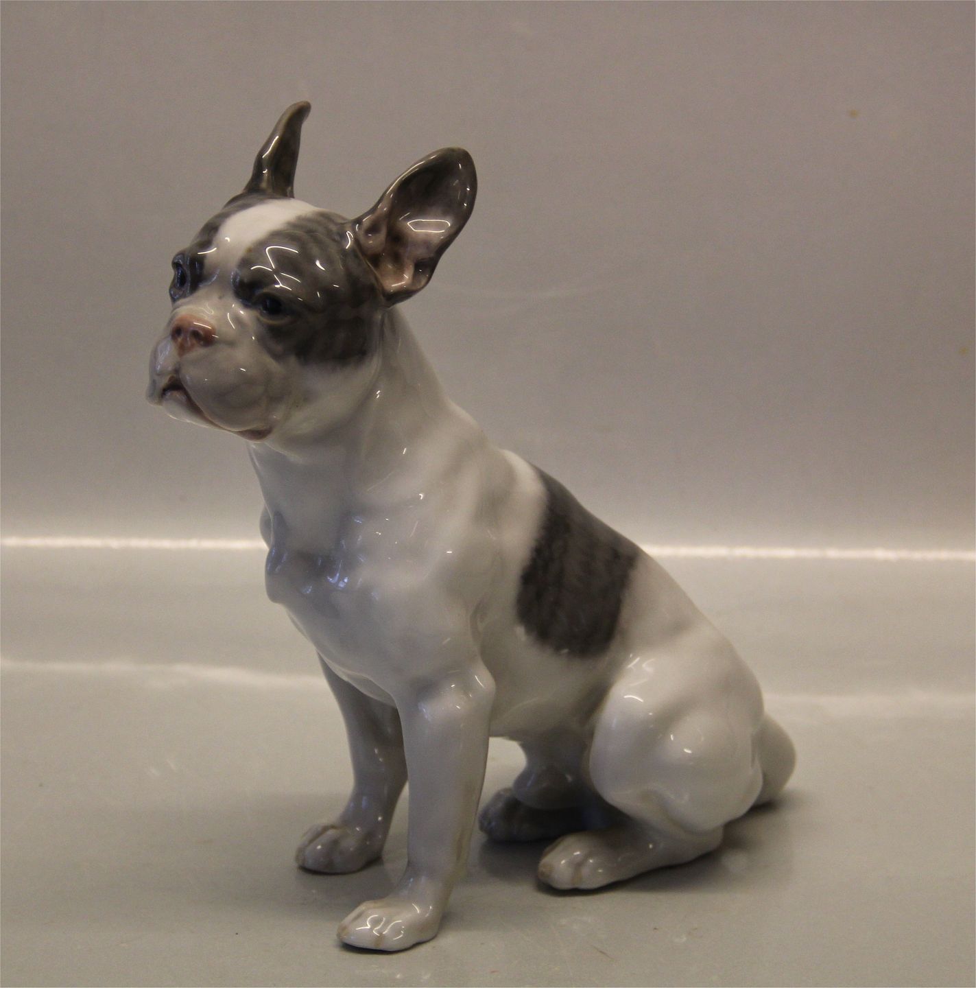 Kgl. hundefigur 1466 Kgl. Fransk Bulldog siddende 20 x 18 cm LJ 1913 Broget 1452 fra Royal Copenhagen I hel og fin stand
