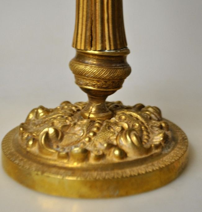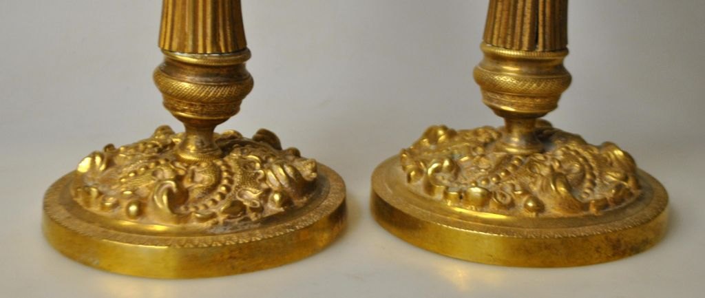 Paar Französisch Kerzenleuchter aus Messing / Bronze, vergoldet, 19. Jahrhundert. Fuß mit Rokoko Dekoration und Stam. H: 24 cm.Bestellnummer: 12287