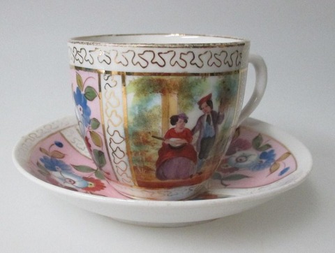 Deutsch Porzellantasse mit Bemalungen, 19. Jahrhundert. Mit Untertasse. Tasse mit Blumen und Musikszenen dekoriert. Mit Vergoldung. Höhe der Tasse: 6,4 cm. Dia. Untertasse: 12,2 cm.Bestellnummer: 12479
