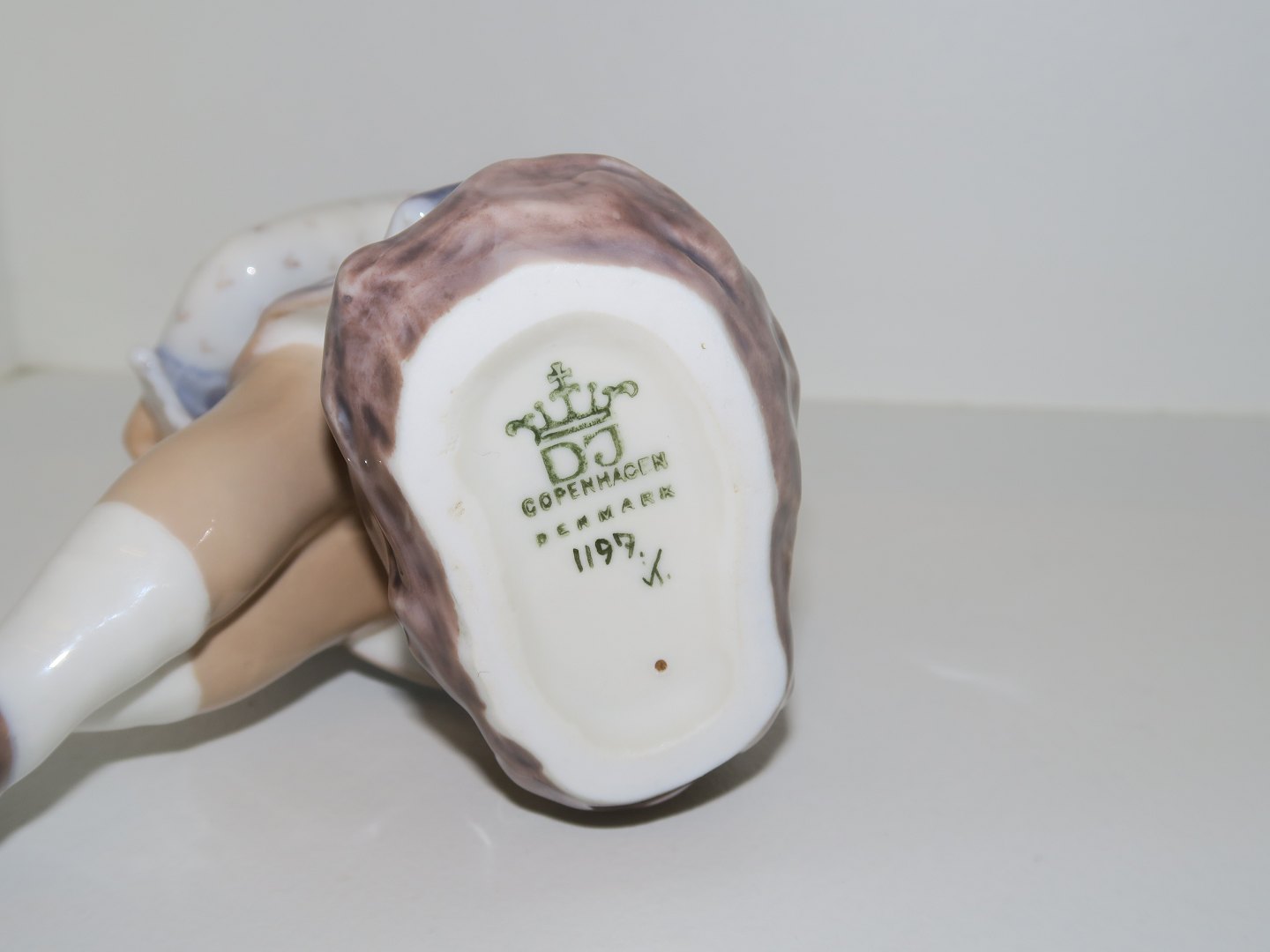 Dahl Jensen figur, Pige med strikketøj.Af fabriksmærket ses det, at denne er produceret mellem 1928 og 1985.