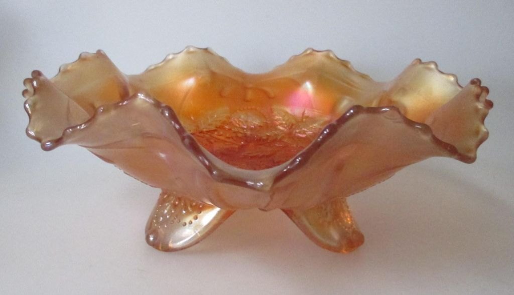 Amerikanische gedrückt Glasschale, orange irriseret, 20. Jahrhundert. Dekoriert mit Blätter und Beere. Dia:. 22 cm. H:. 8,5 cm. Einwandfreiem Zustand!Bestellnummer: 17651