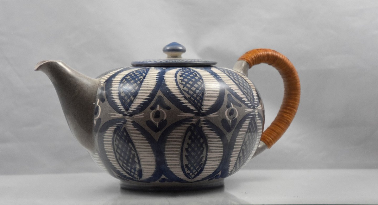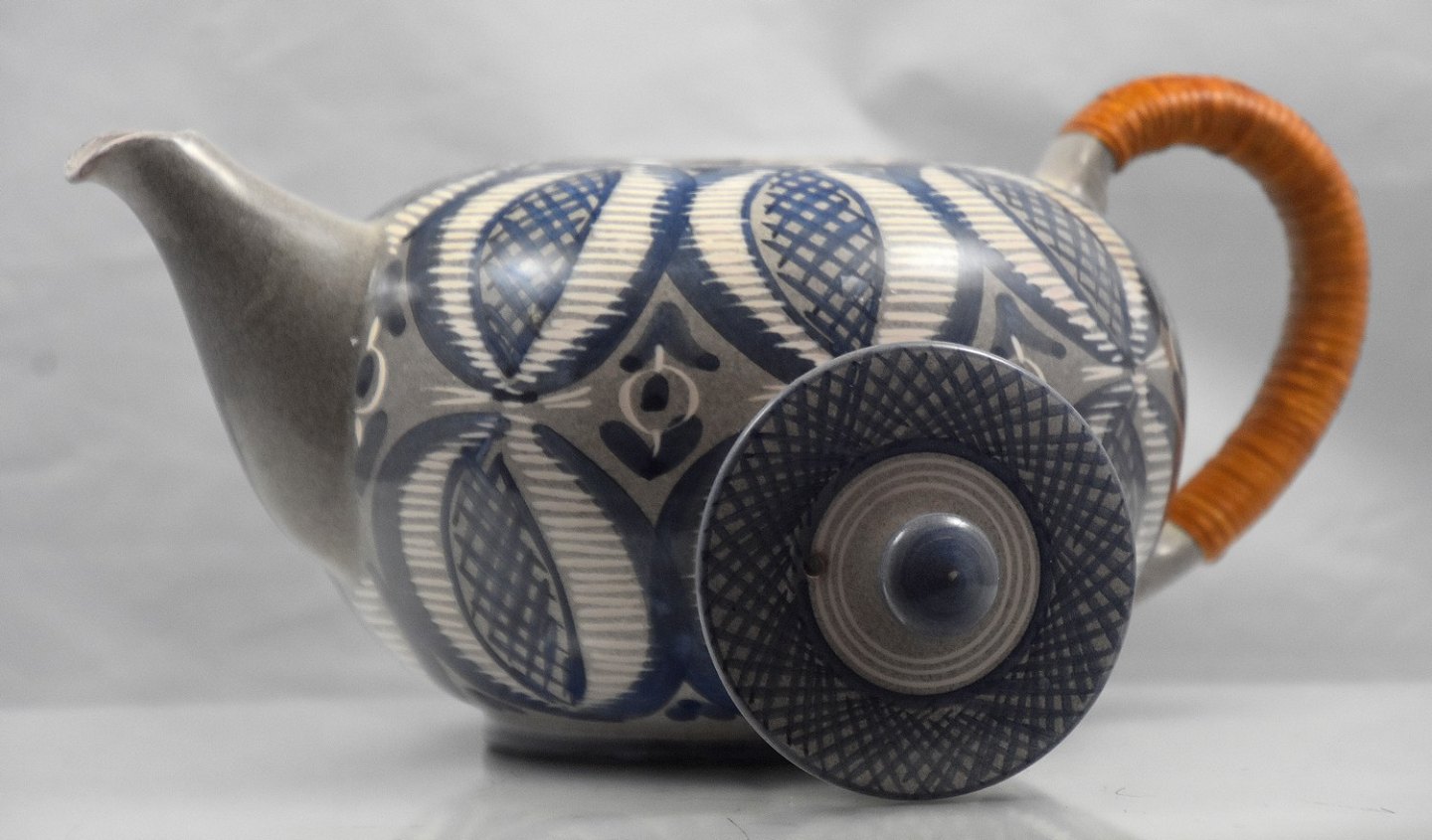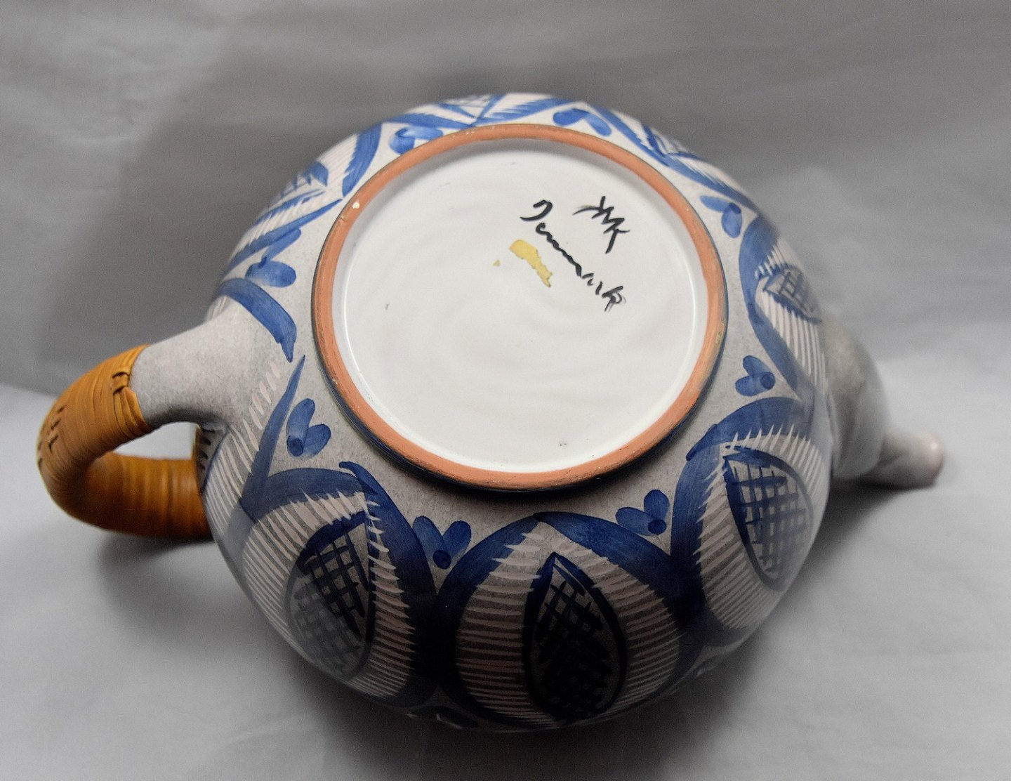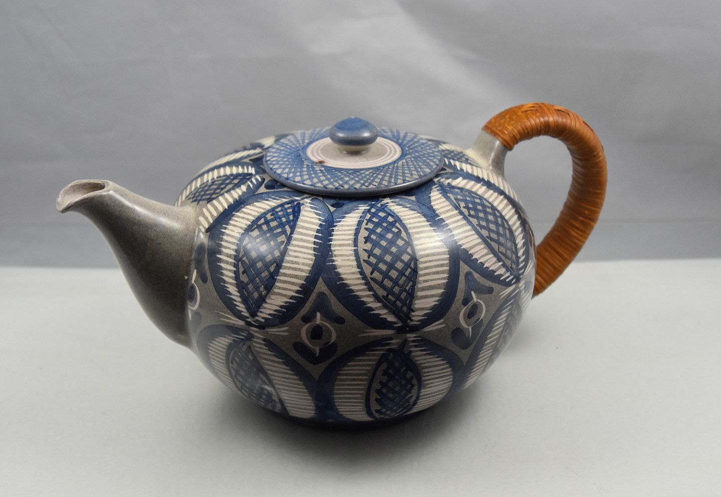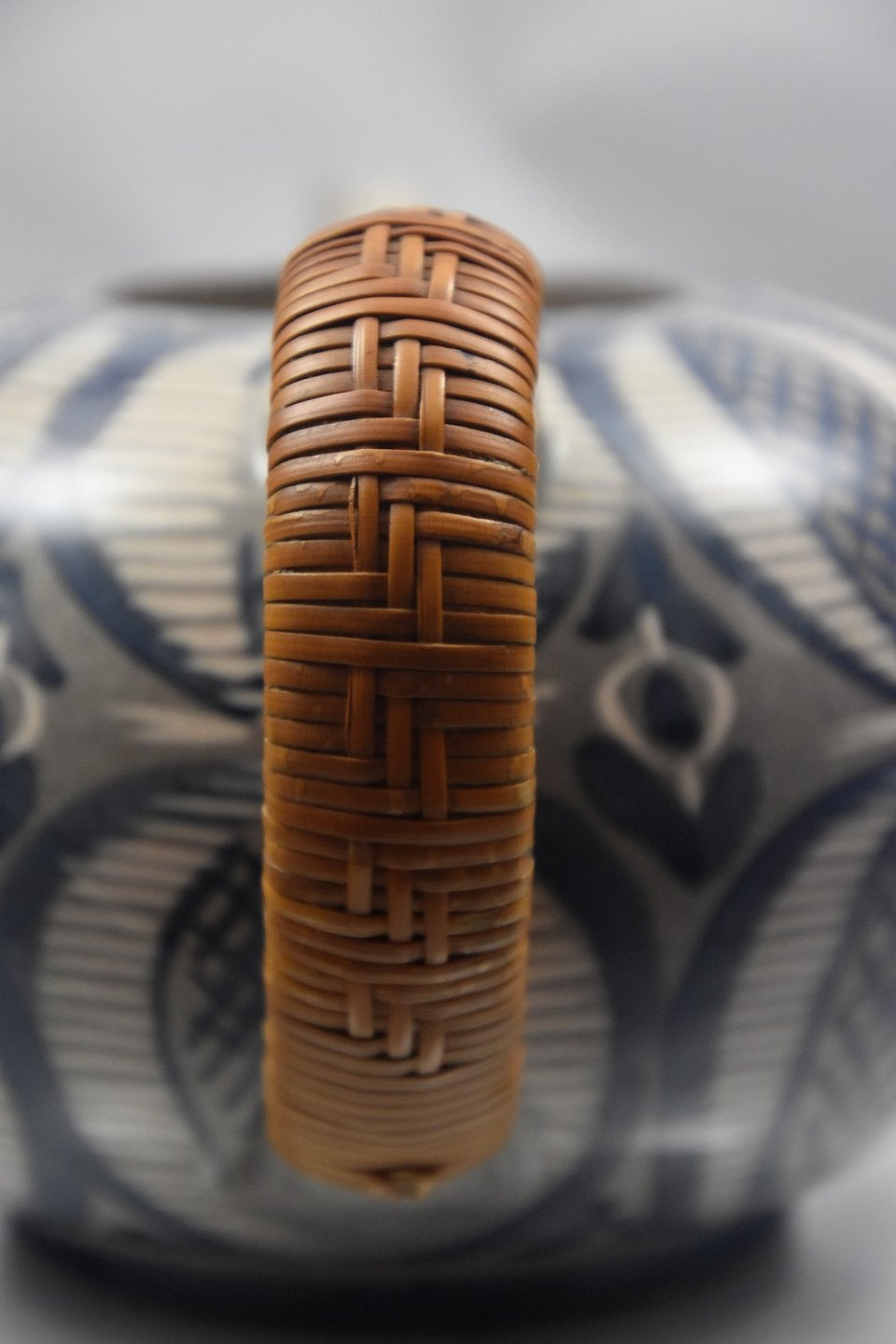 Karen Margrethe Karberg tekande i blå farvet mønster flettet hank.H.: 13,5 cm. Ø.: 28 cm.