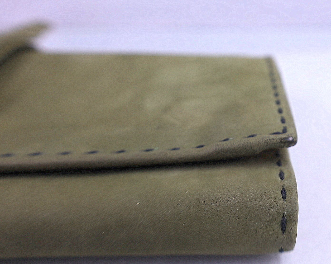 Georg Jensen. Ruskinds damepung, grøn, der er foldet og lukket med strop og sølvspænde. Pungen er foldet i 3 fag, der er 3 lynlåsrum, møntrummet er foret med satin. Pungen er grøn udvendig og cognac farvet indvendig.