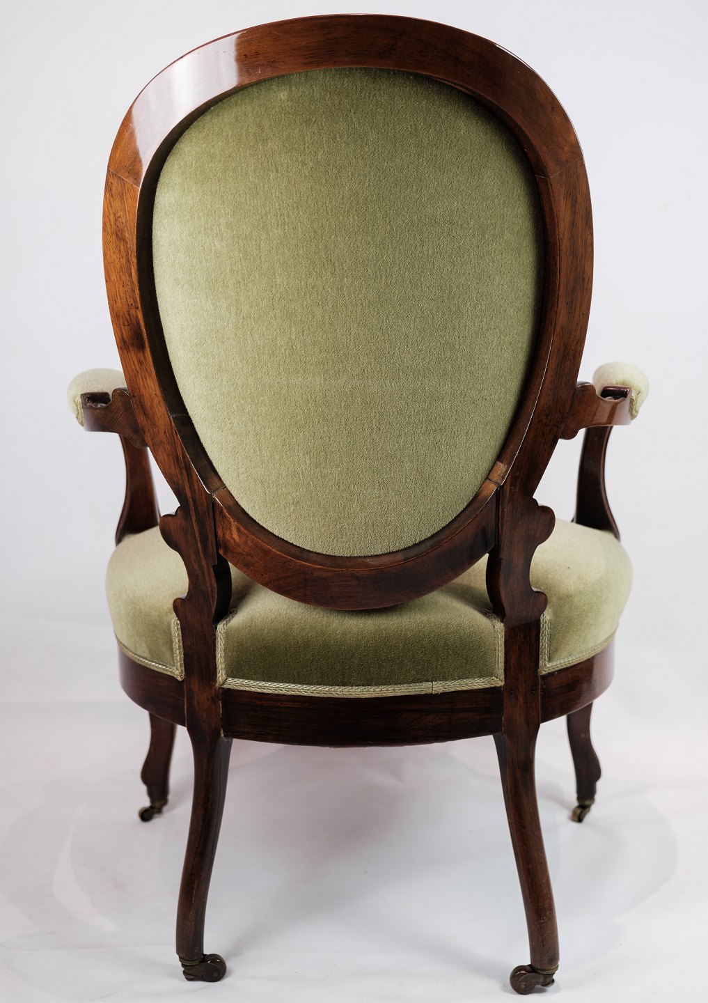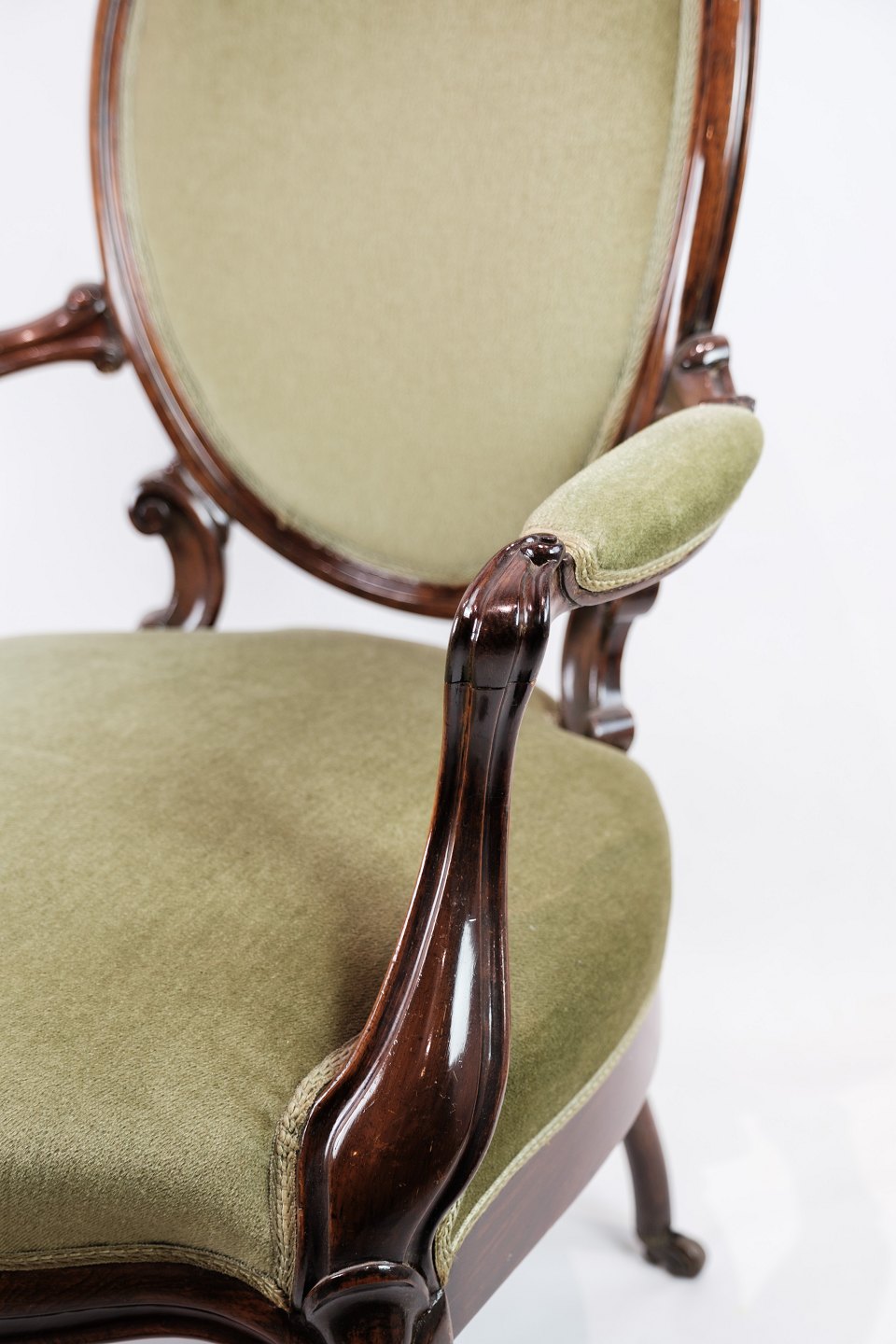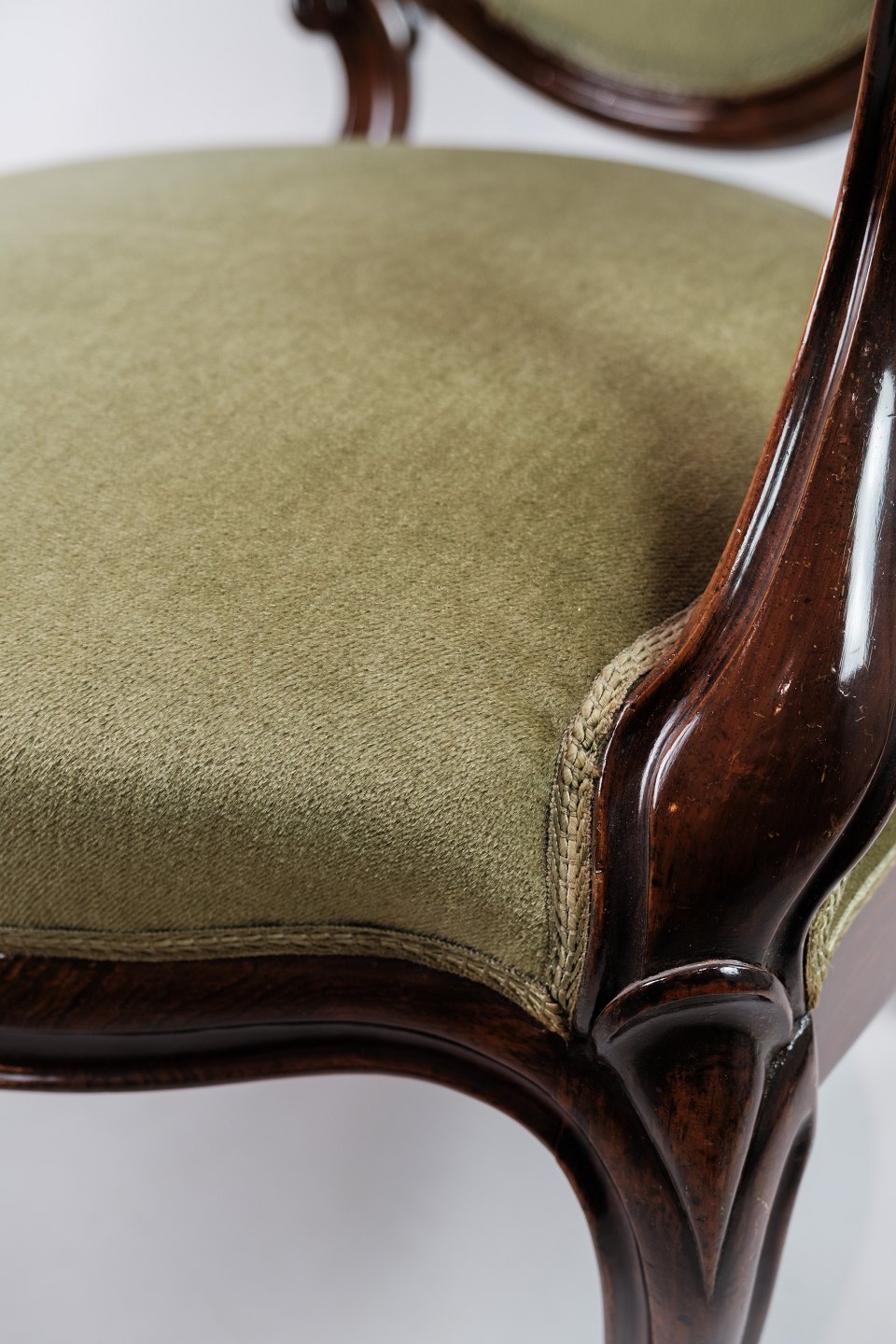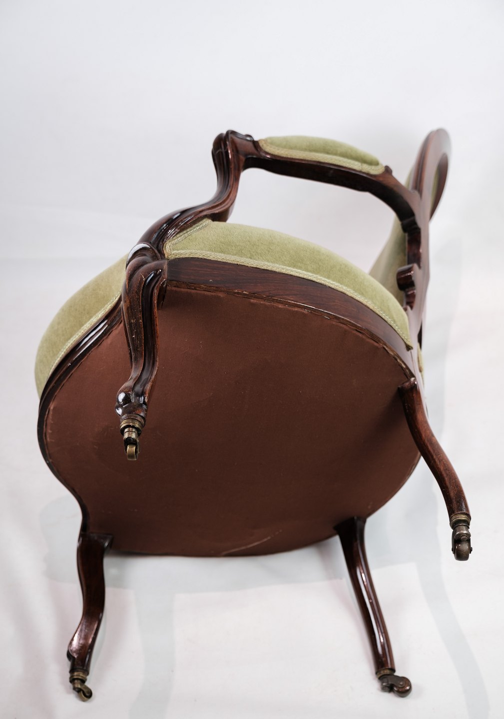 En nyrokoko armstol i mahogni med mærkegrønt velour betræk fra omkring 1880'erne. Står i meget fin stand.Mål i cm: 95 B:59 D:57 SH:40