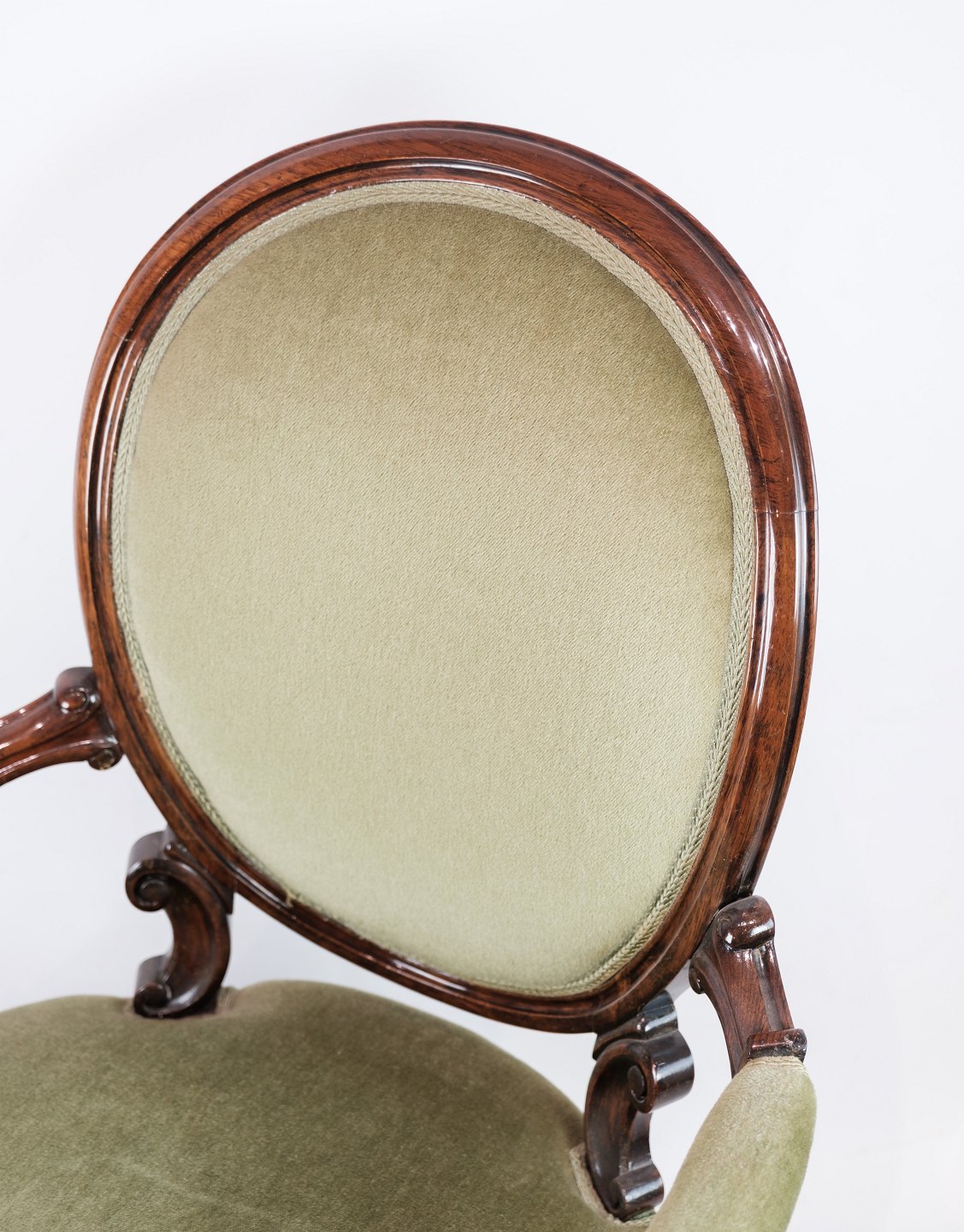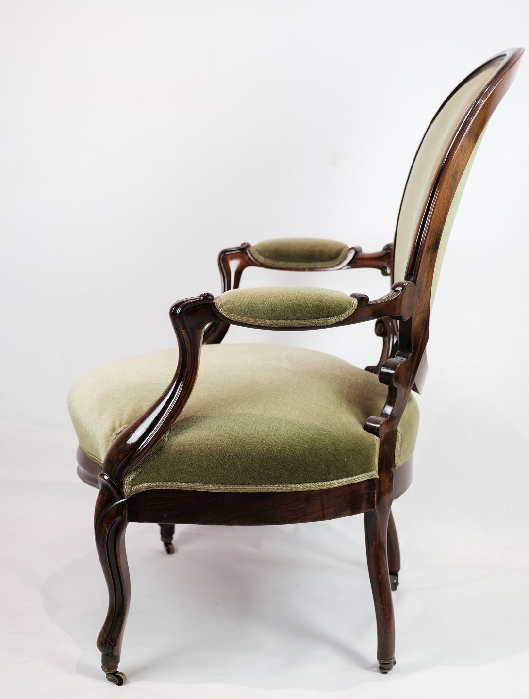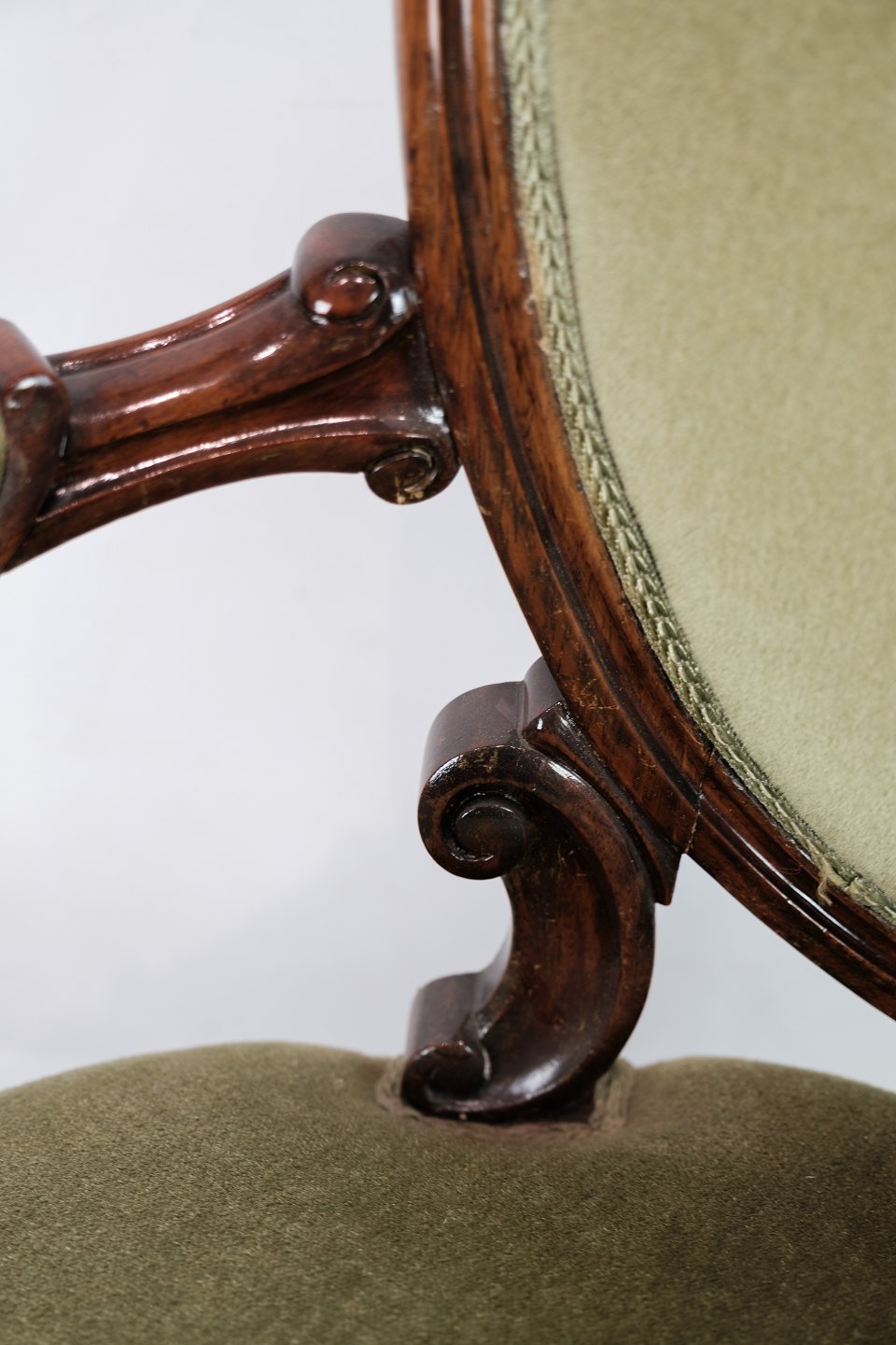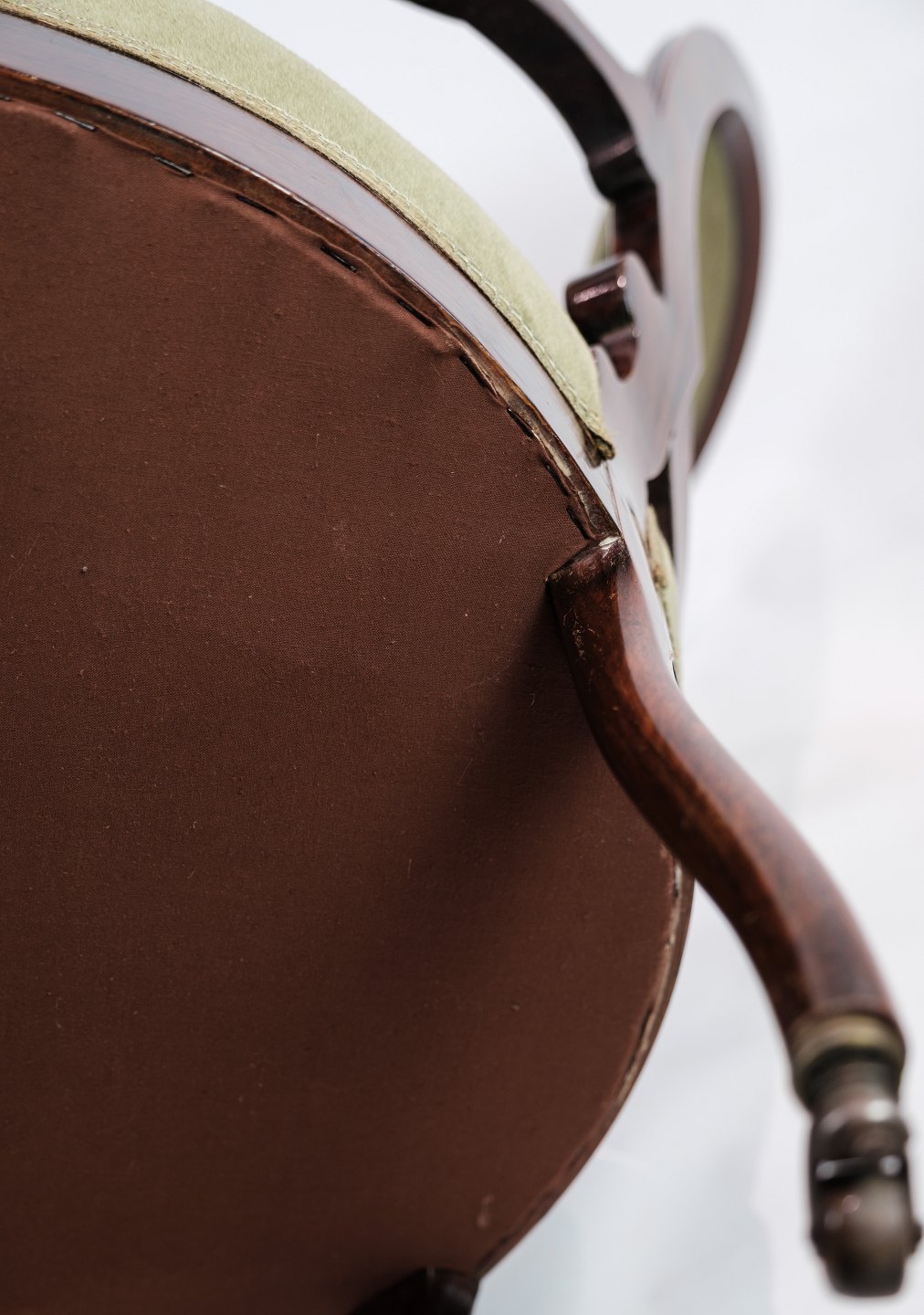 En nyrokoko armstol i mahogni med mærkegrønt velour betræk fra omkring 1880'erne. Står i meget fin stand.Mål i cm: 95 B:59 D:57 SH:40
