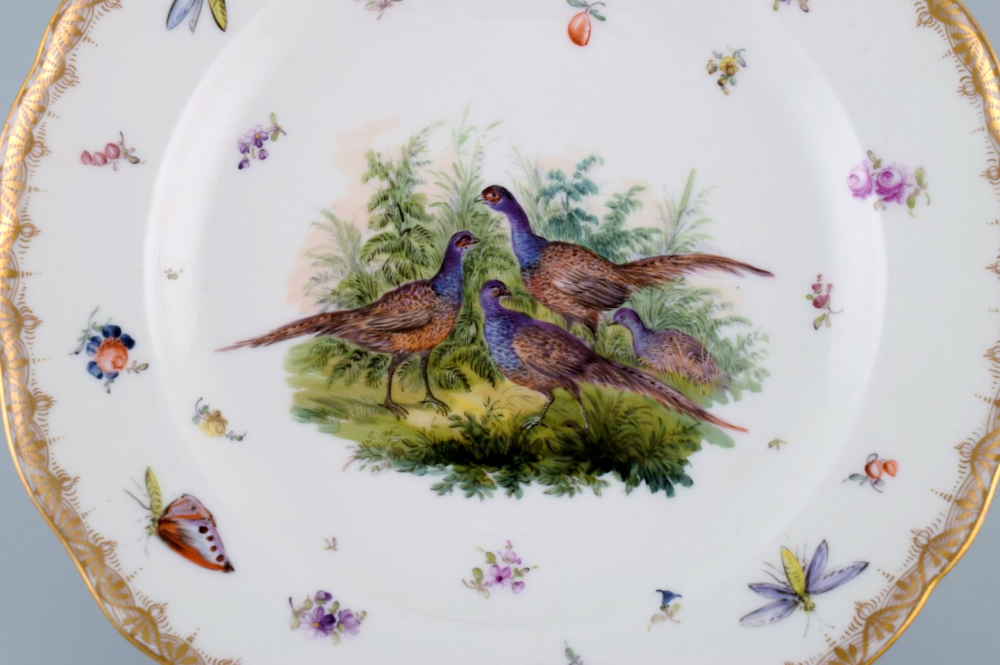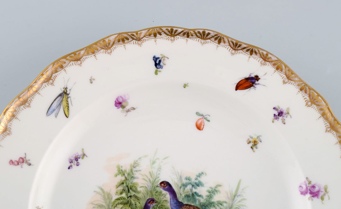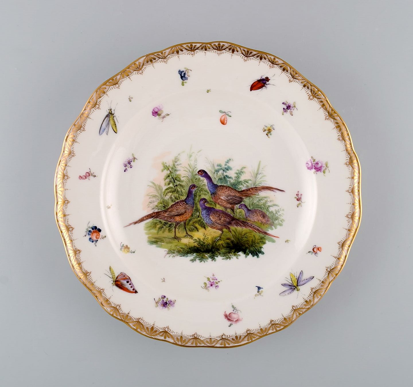 Antik og sjælden Meissen porcelænstallerken med håndmalede fugle, insekter og gulddekoration. 1800-tallet.Diameter: 24,5 cm.