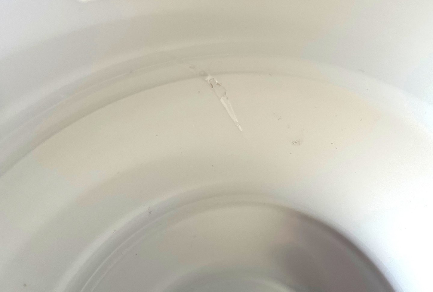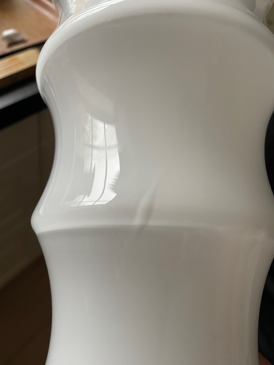 Holmegaard, Karen Blixen opalinehvid vase stor størrelse. Designet af Anja Kjær i 2000. Vasens form er inspireret af afrikanske kvinders hals og armringe. Højde 30,5 cm. Diameter 17,5 cm. OBS der er 2 indvendige produktionsfejl. Den øverste som en revne i glasset, den nederste som en boble, den kan ses udefra. Pris: 400 kr. stk. Lager: 1 Händler