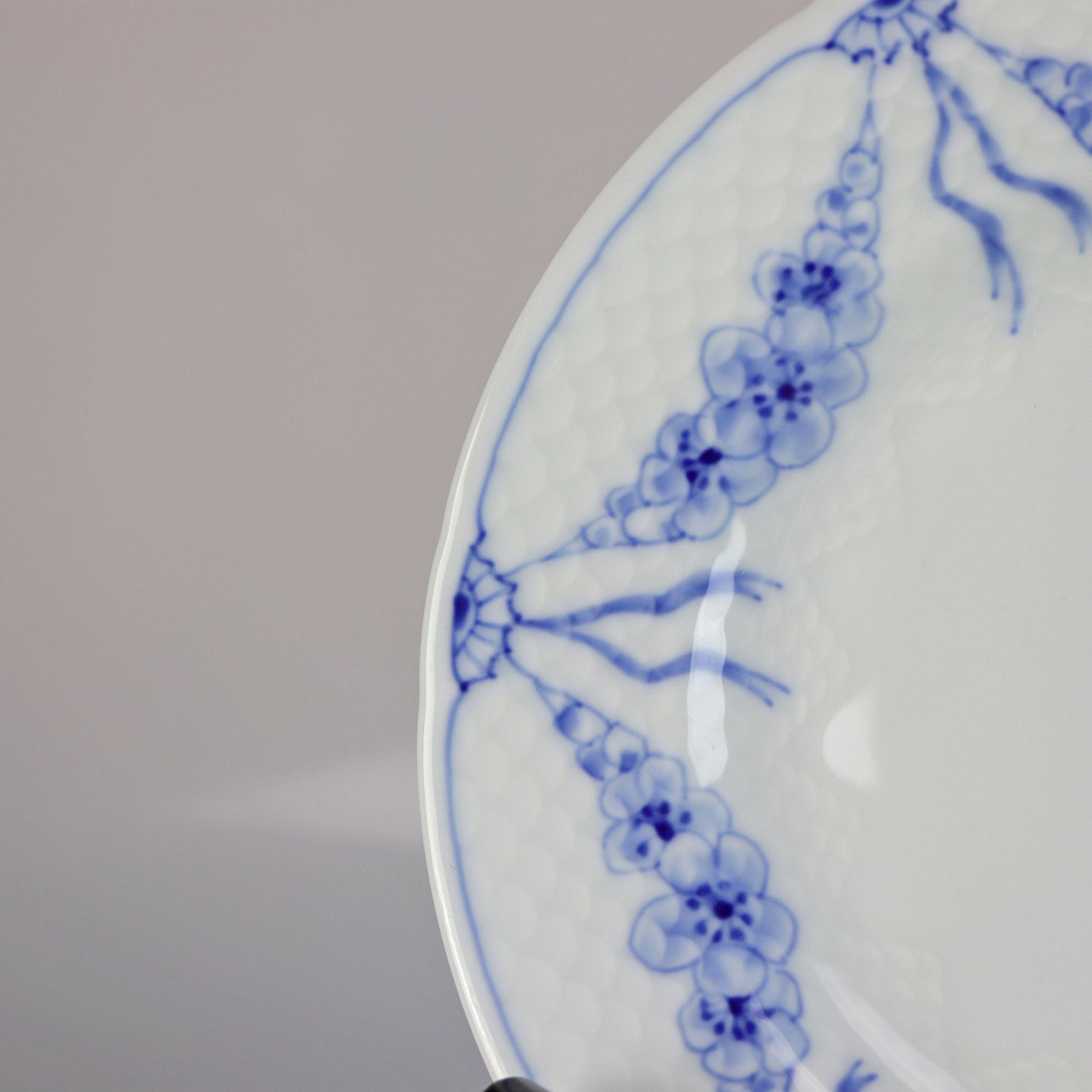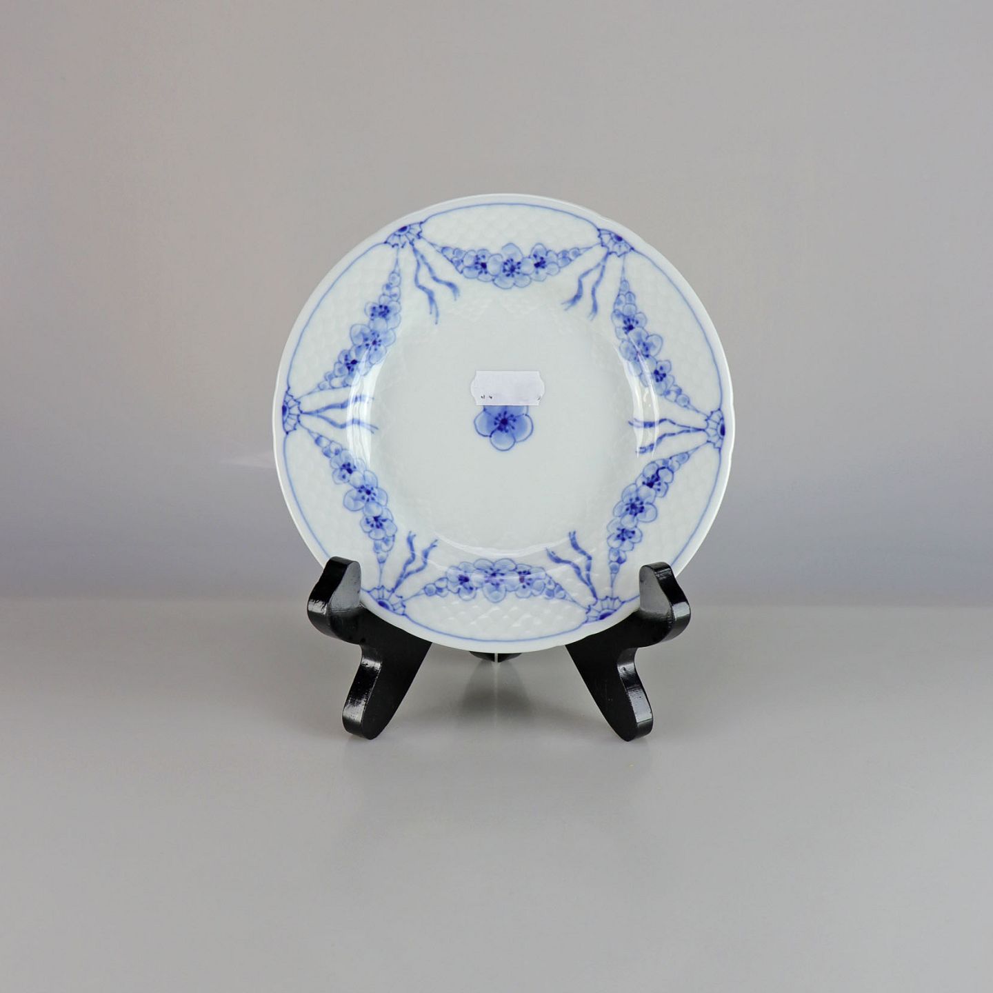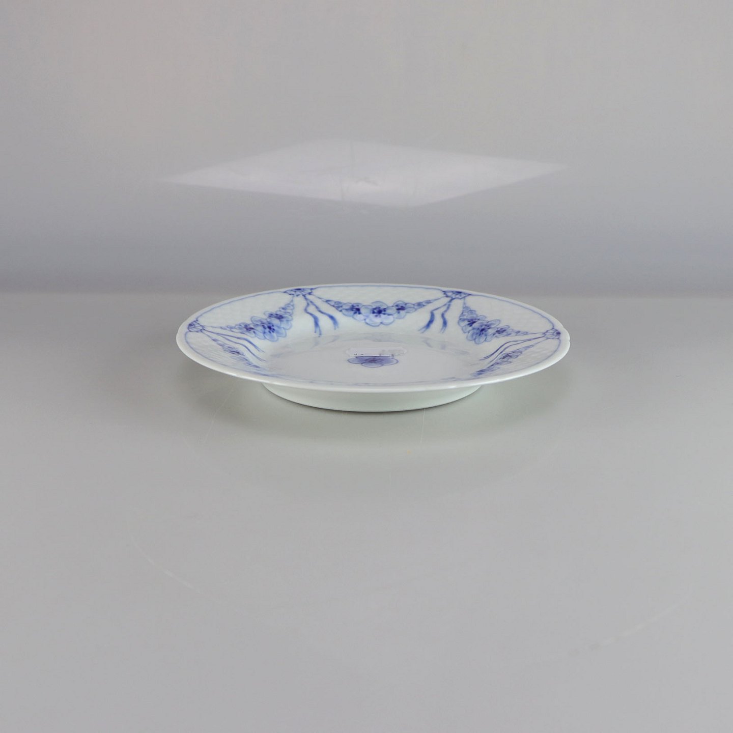 Tallerken i hvidt porcelæn med skelform og motiv af guirlander med blå blomster
