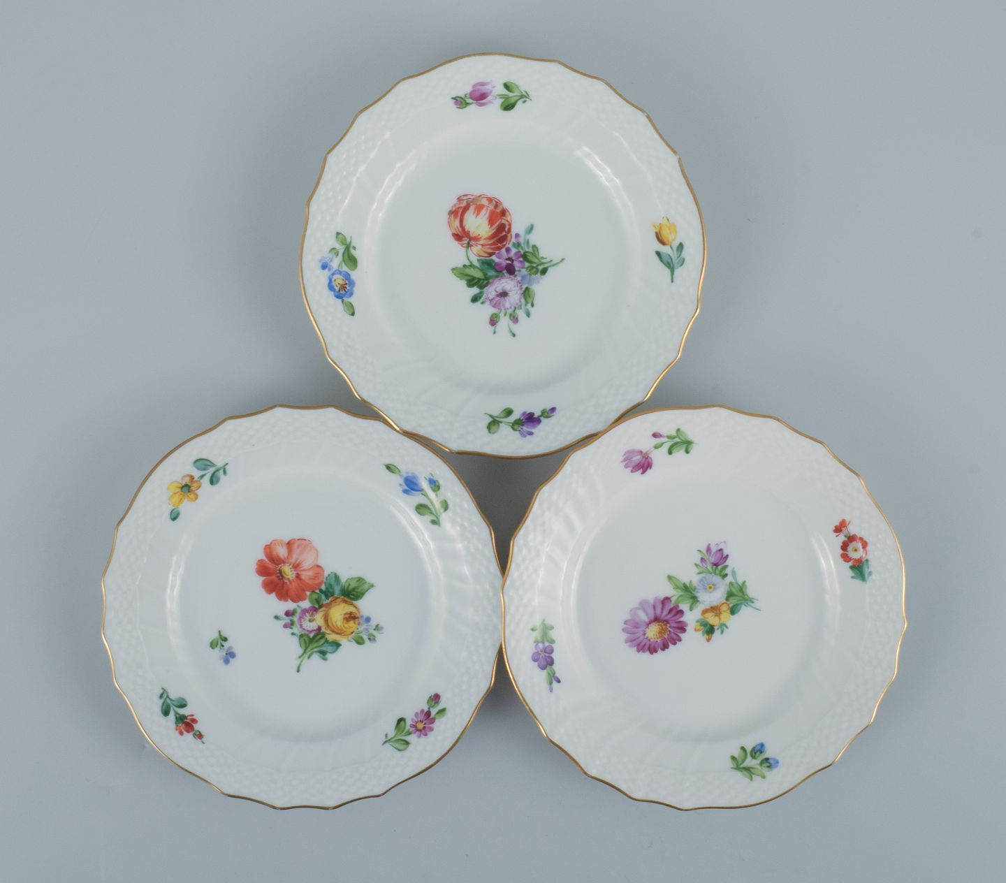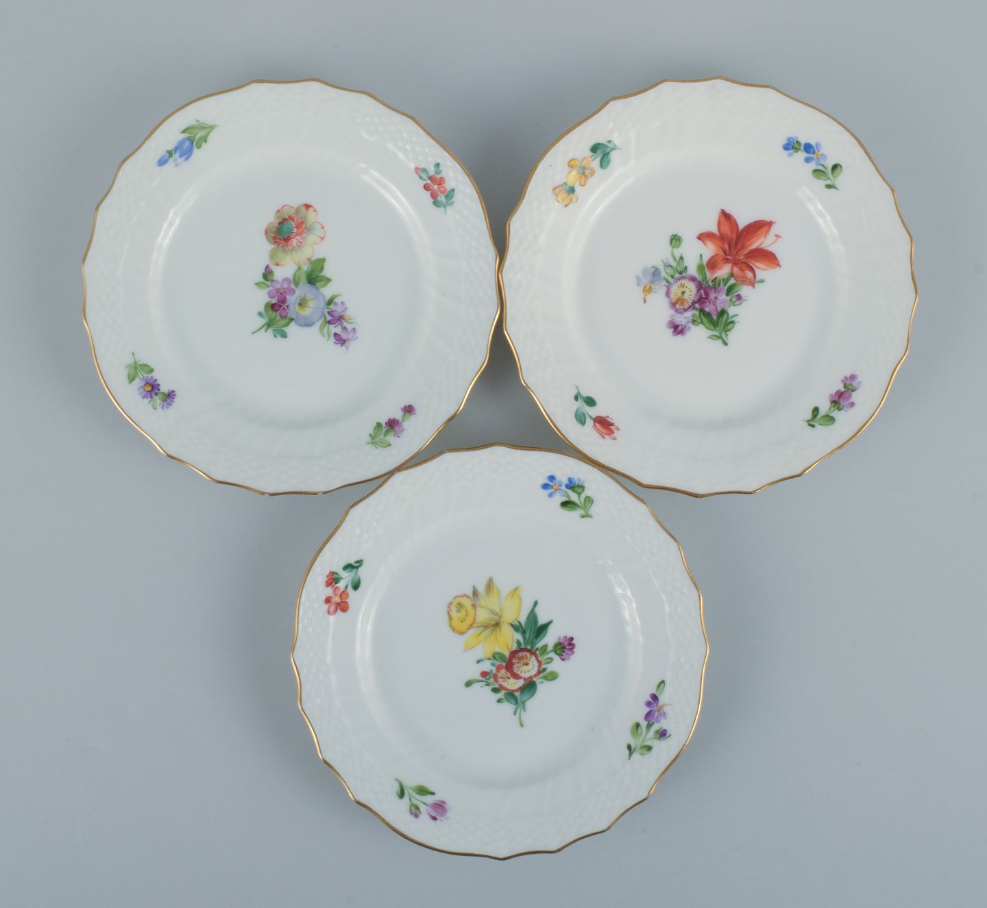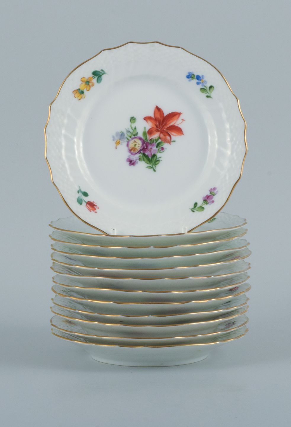 Royal Copenhagen, Let Saksisk Blomst. Tolv tallerkner af porcelæn, dekoreret i farver og guld med blomster.