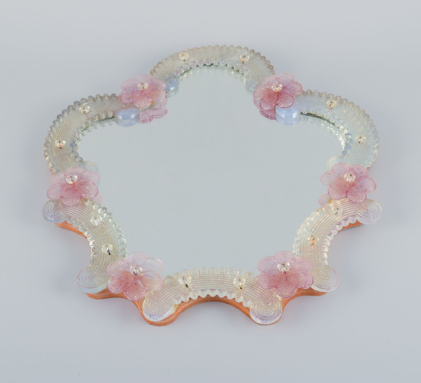 Murano, Venedig, spejl i kunstglas, guld og rosa dekoration.