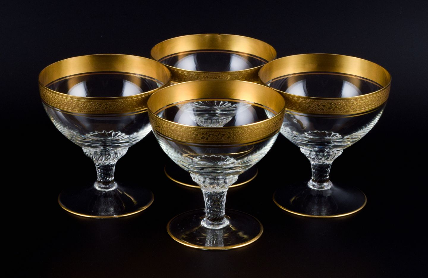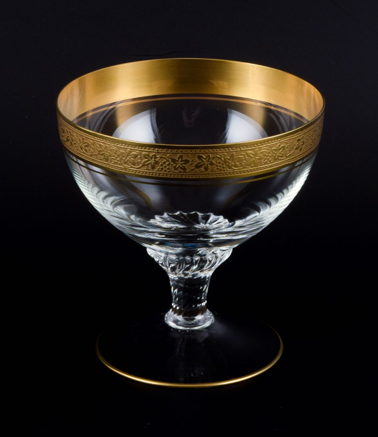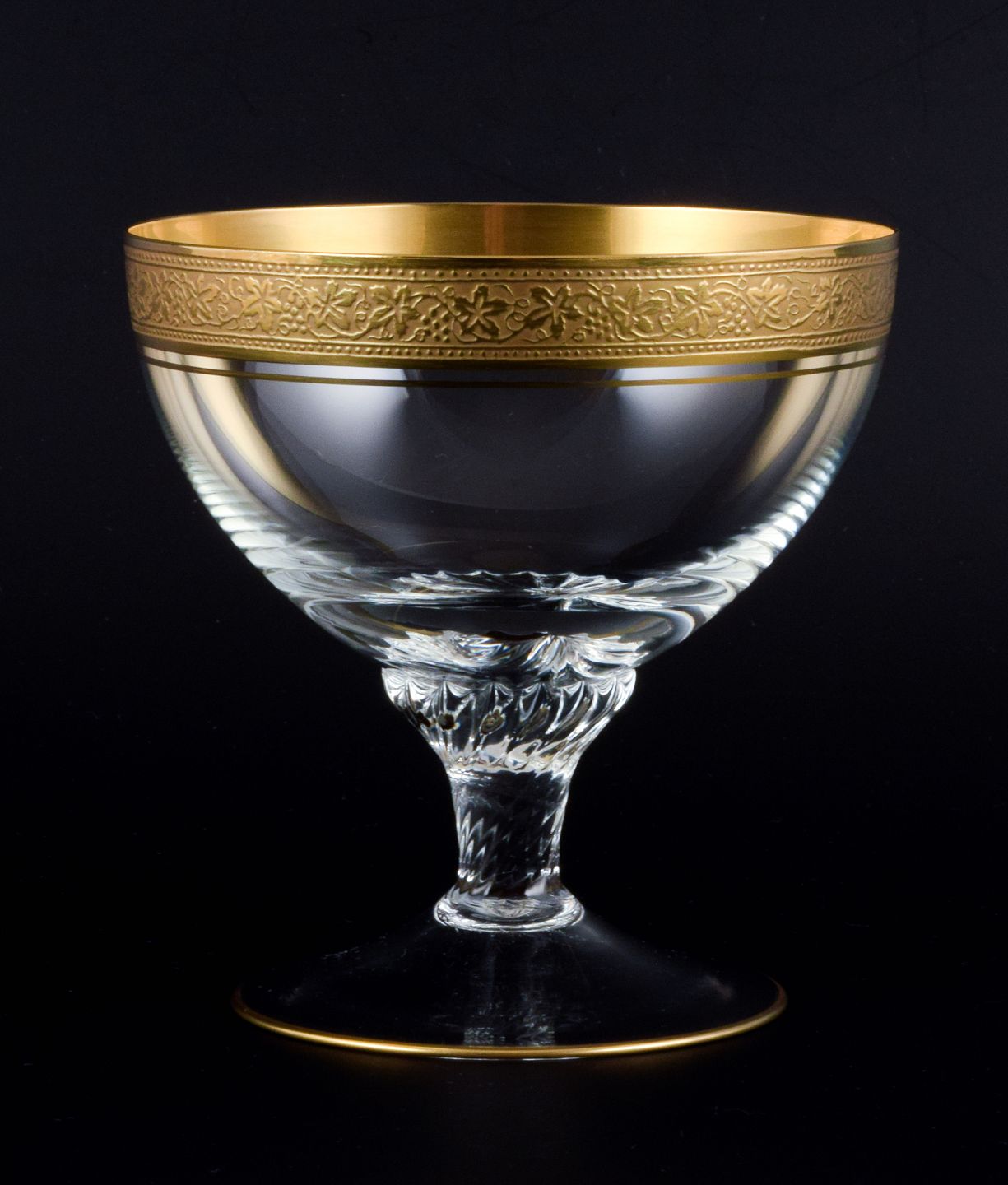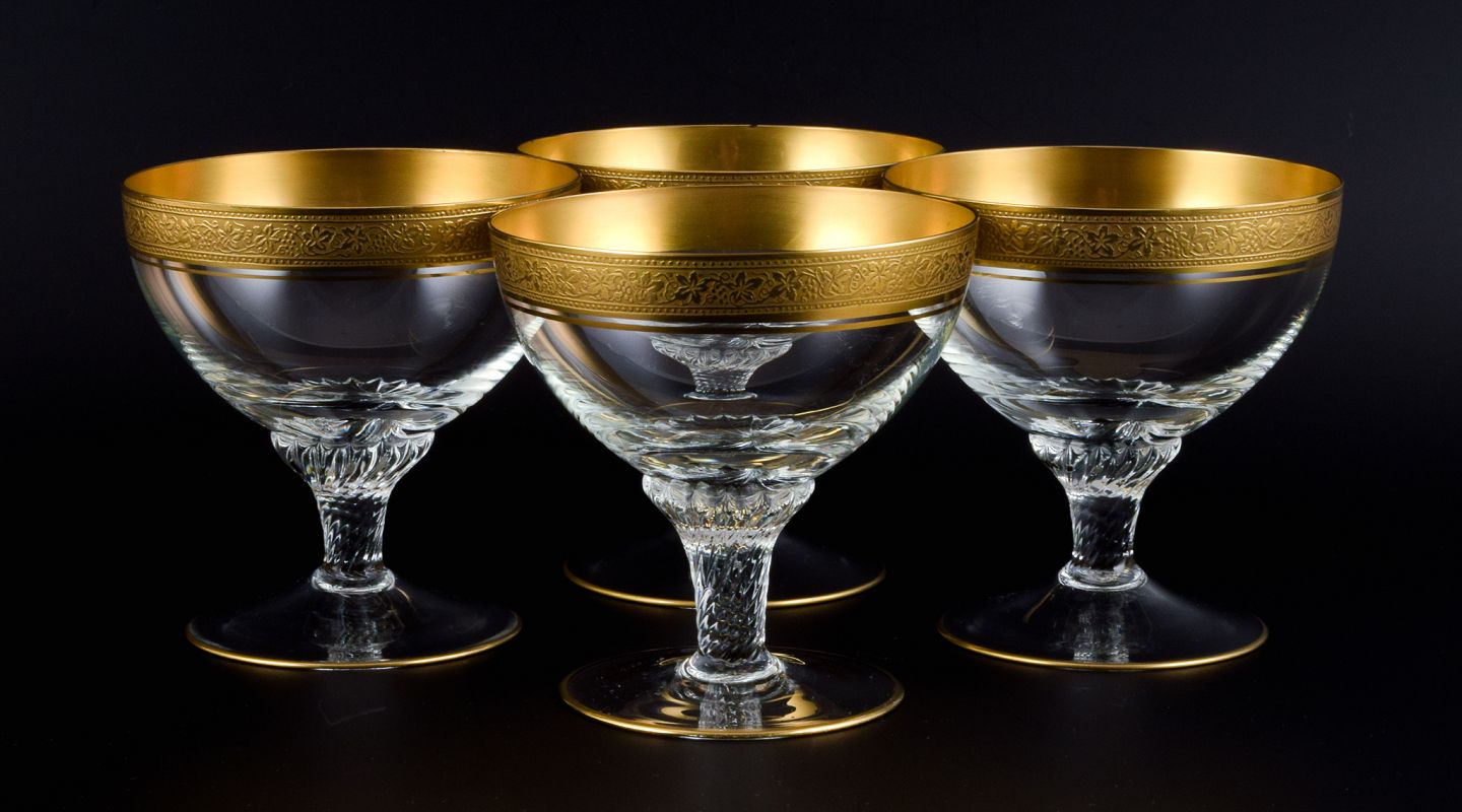 Rimpler Kristall, Zwiesel, Tyskland, fire mundblæst krystal champagneskåle med guldkant dekoreret med vindruer og vinblade.