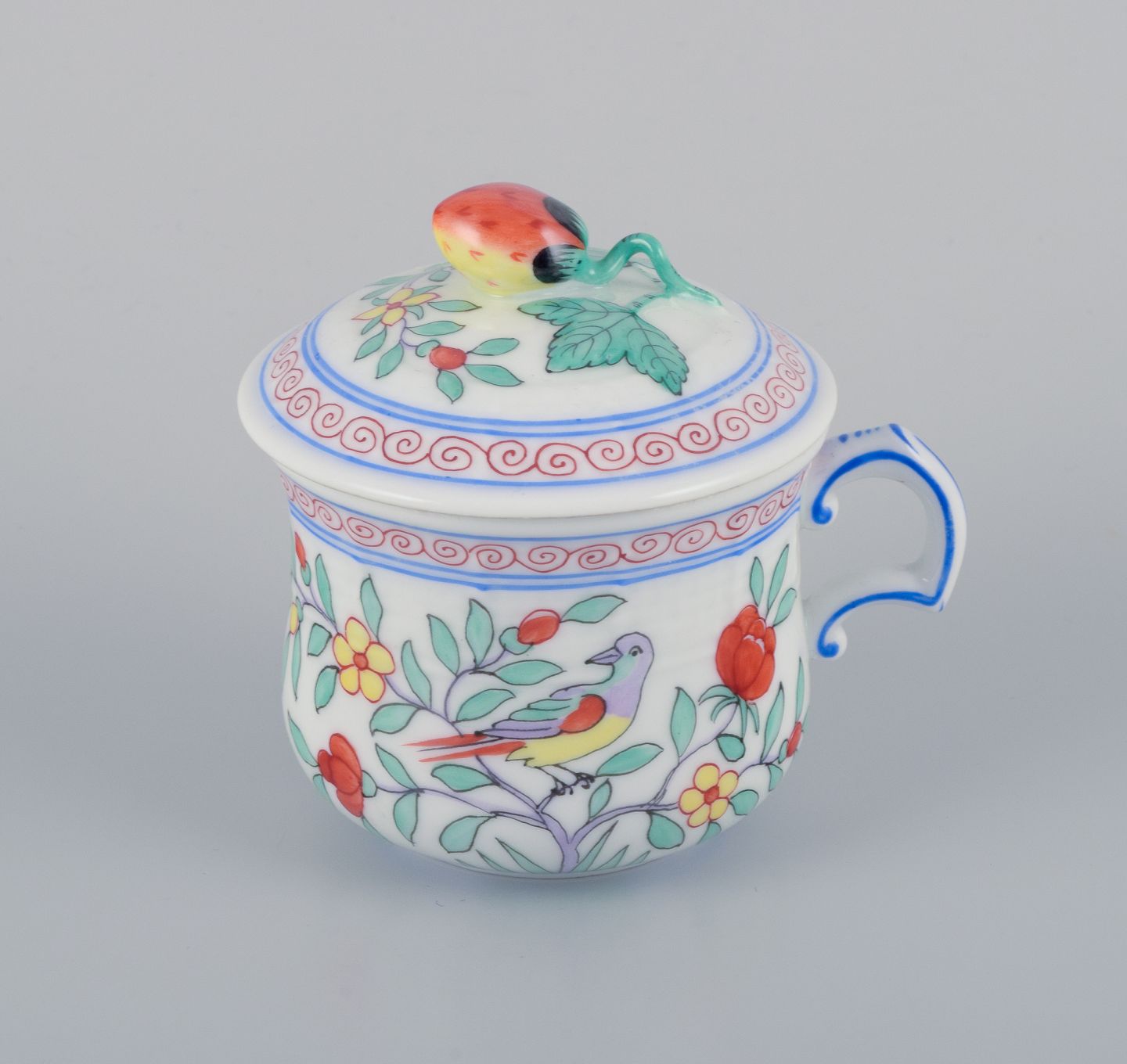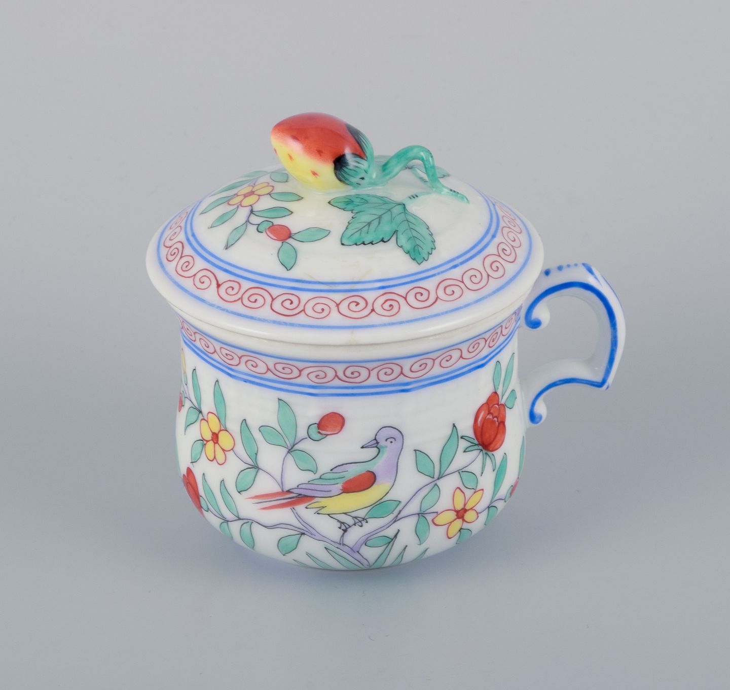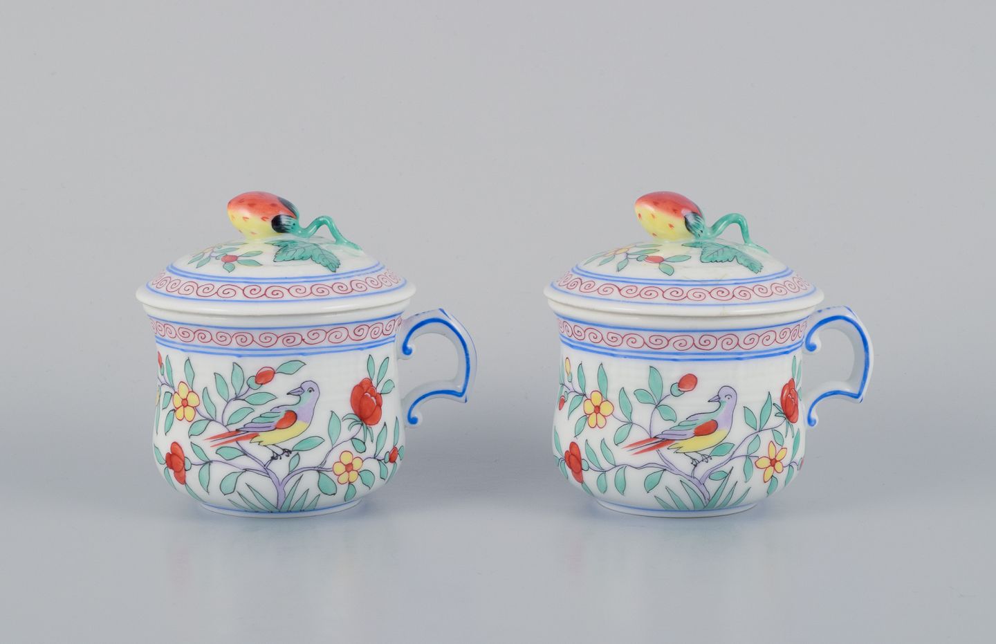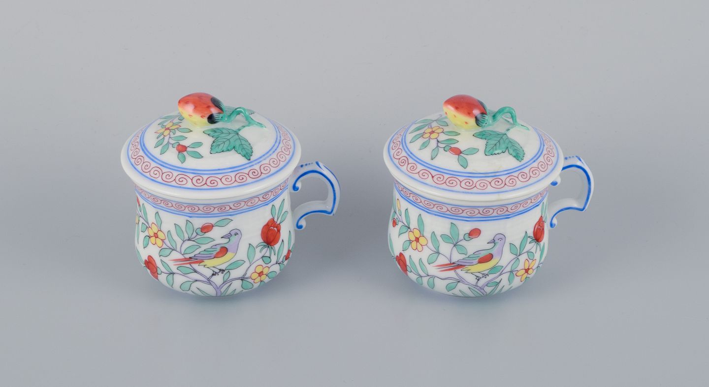 Herend, Ungarn, to bouillonkopper i porcelæn, håndmalet med blomster og fugle.Låg med blomsterknop i relief.