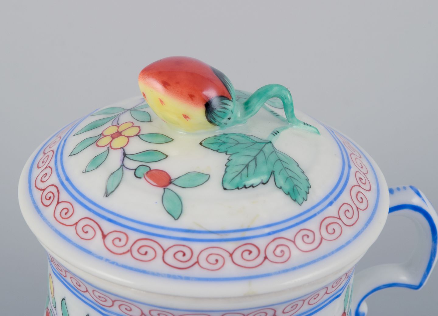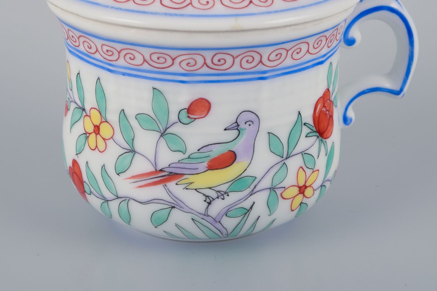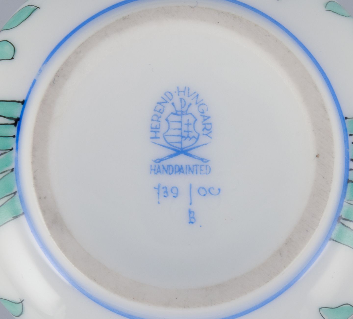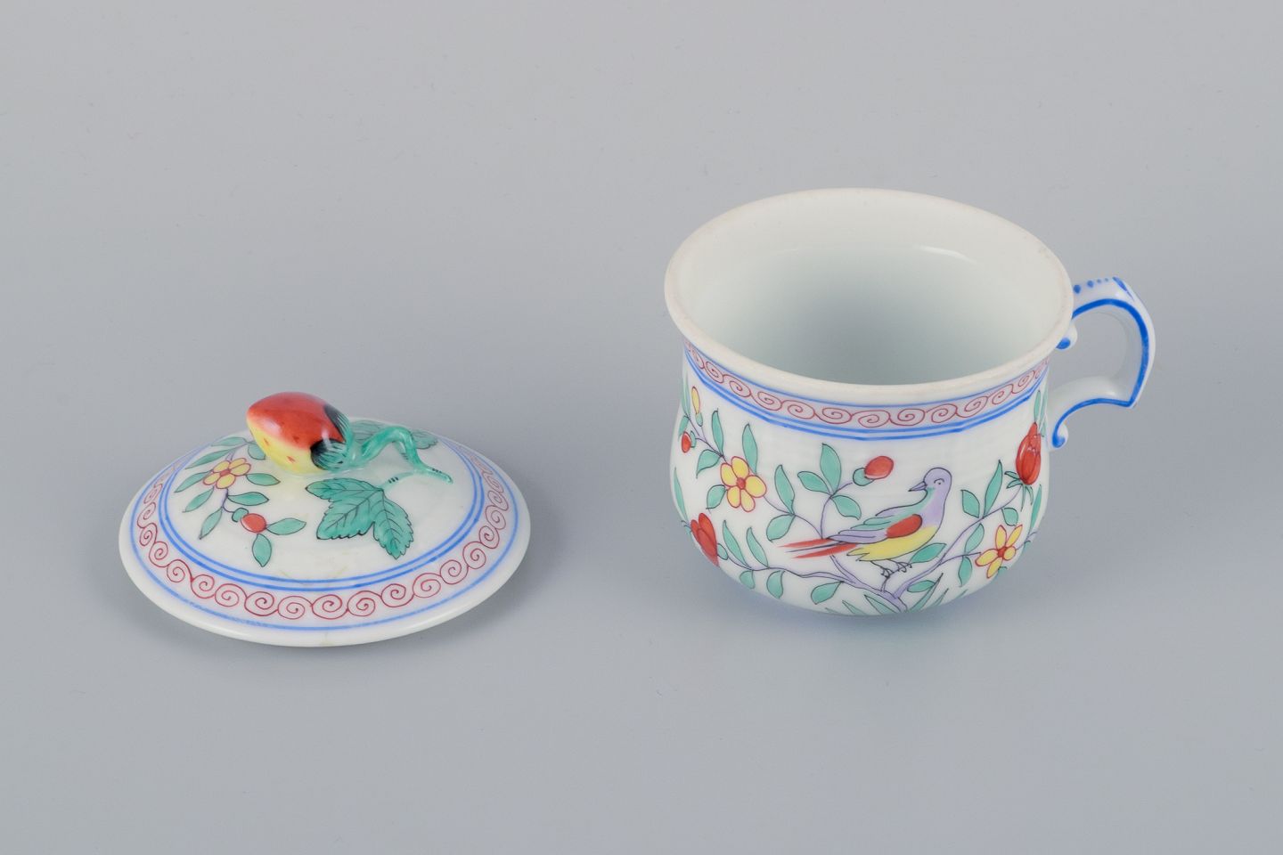 Herend, Ungarn, to bouillonkopper i porcelæn, håndmalet med blomster og fugle.Låg med blomsterknop i relief.
