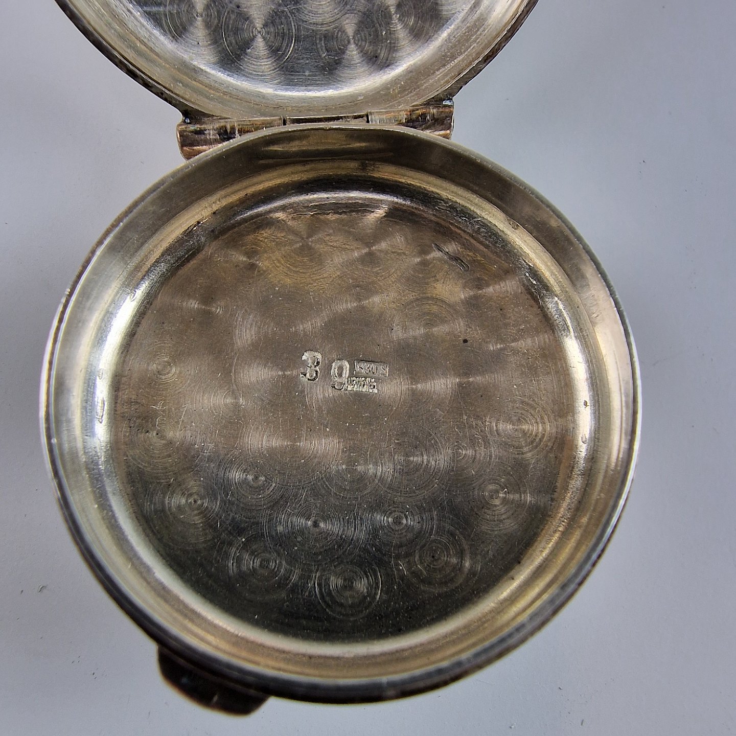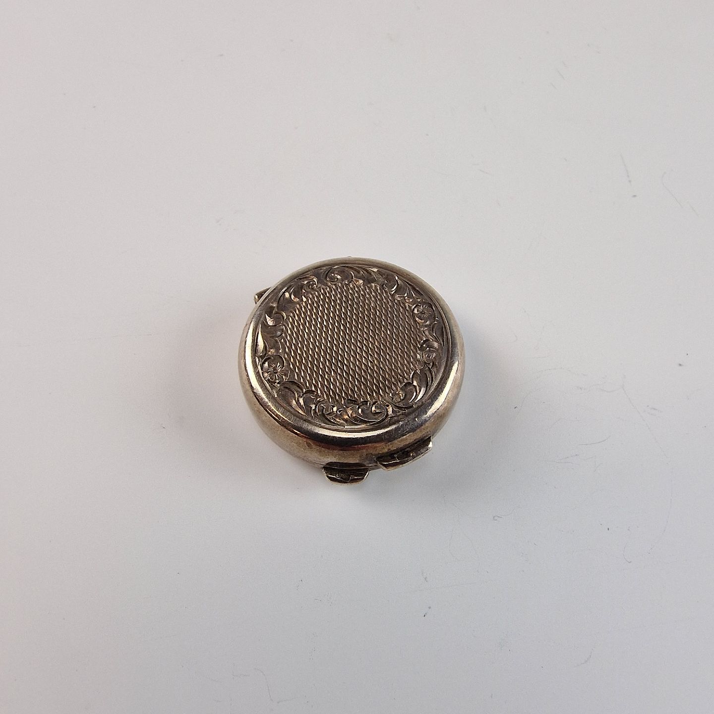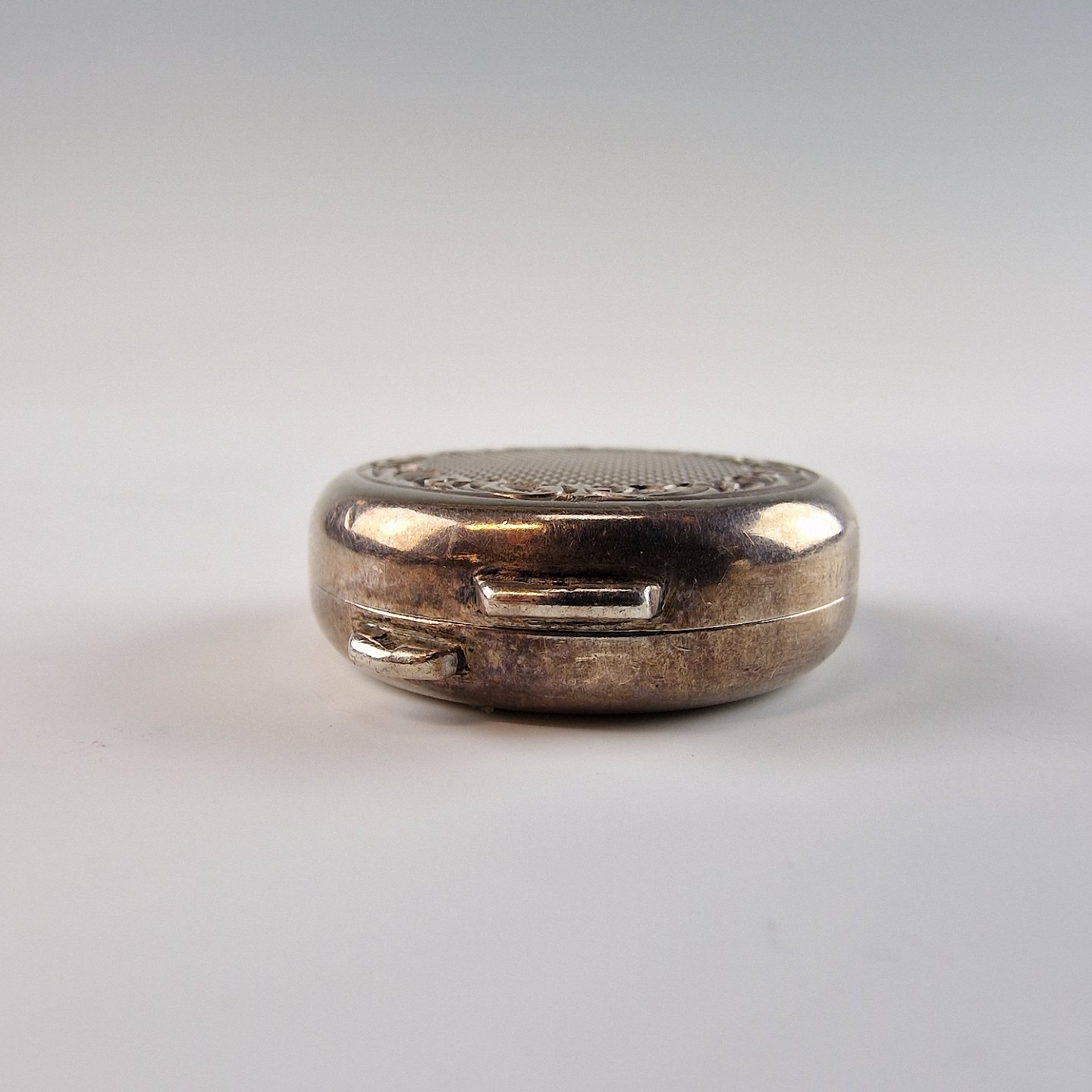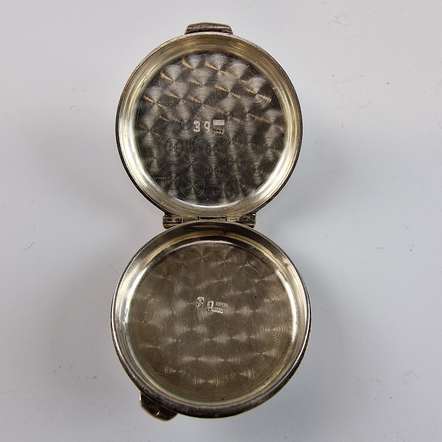 Rund pilleæske af sølv med forskellige mønstre på låget. Tallet 39 er stemplet i lågetStemplet 830s