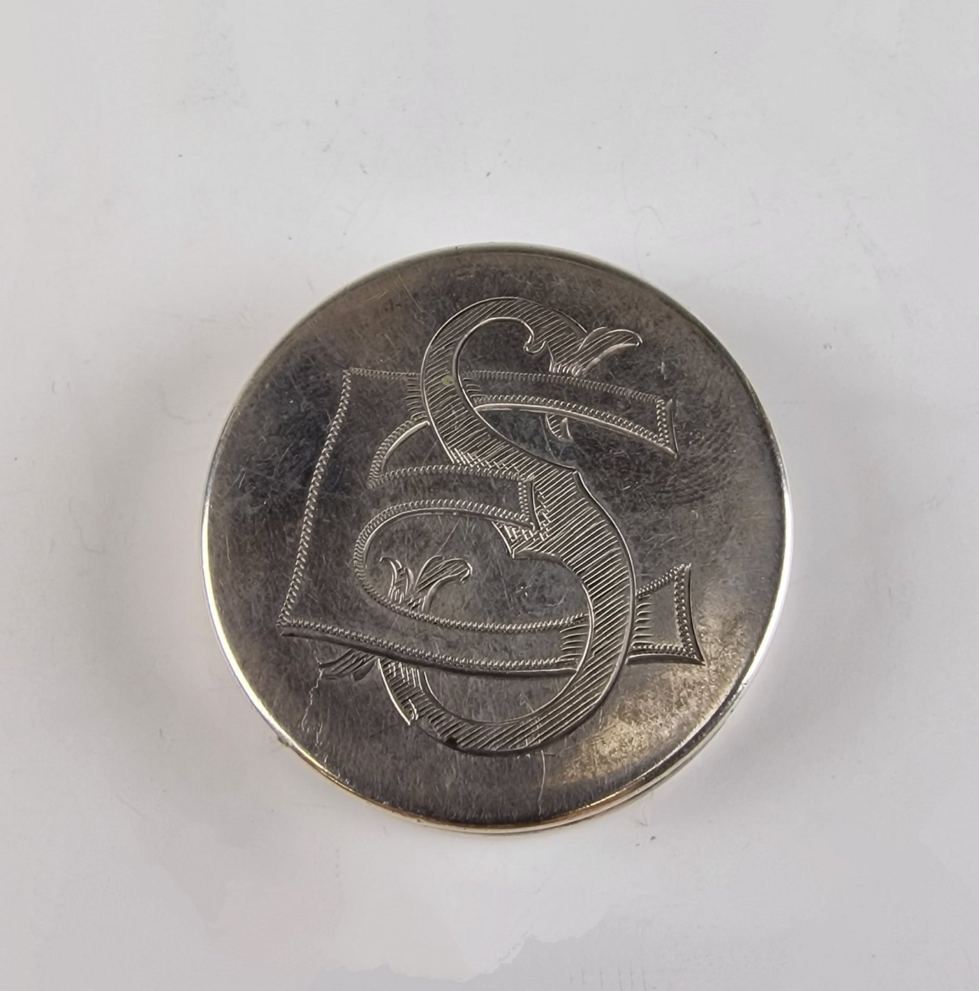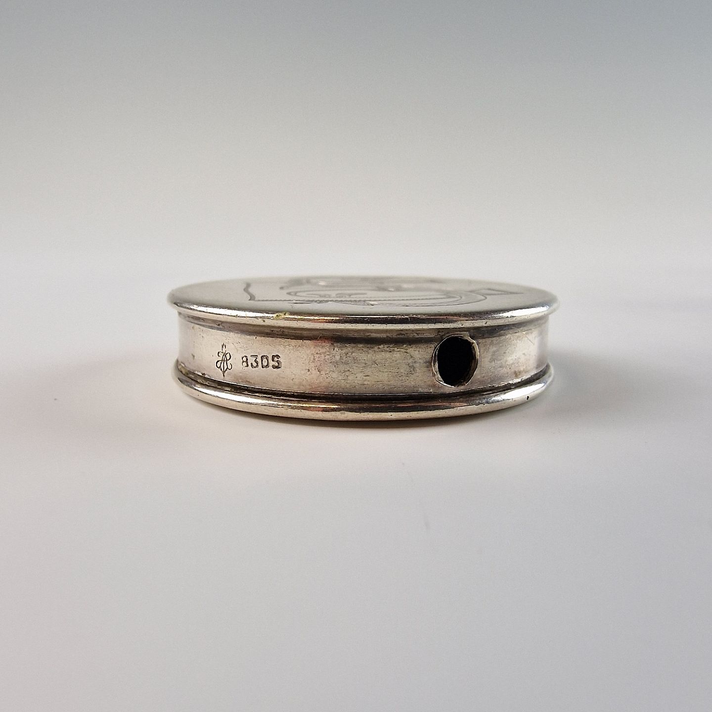 Rund pilleæske i sølv med indgraveret ES på lågetStemplet 830s