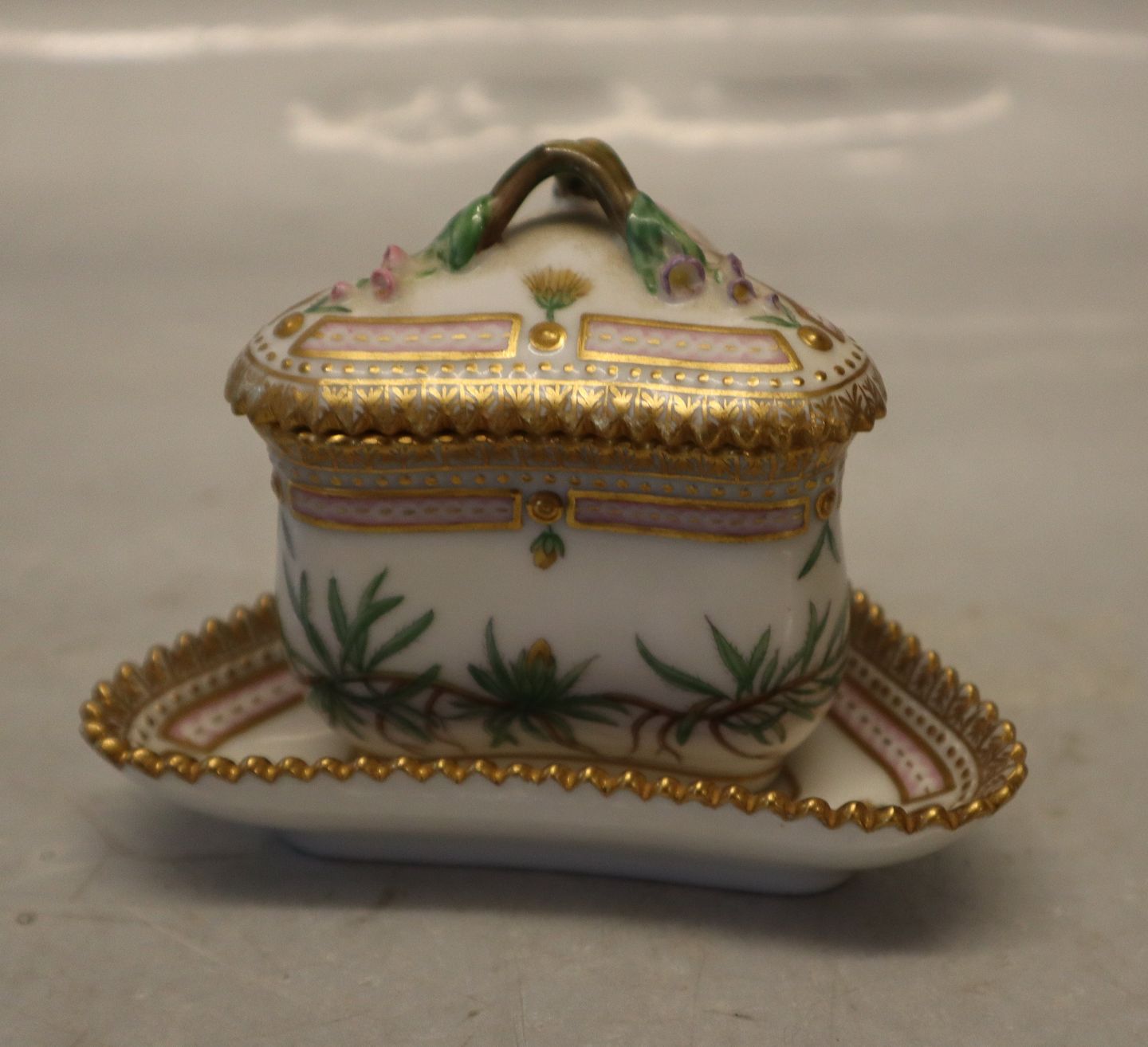Kongelig Dansk Porcelæn Flora Danica 20-3514 Flora Danica cremekop Gnaphalium supinum will 5 x 7 cm 3576 underkop 11 cm , 3575 Låg Royal Copenhagen Flora Danica Blomstermotiver på guldbelagt perlestel. 1. sortering i fin og hel stand