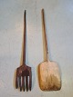 Stor træskae og gaffel, fra 1930erne.De har brugsspor.