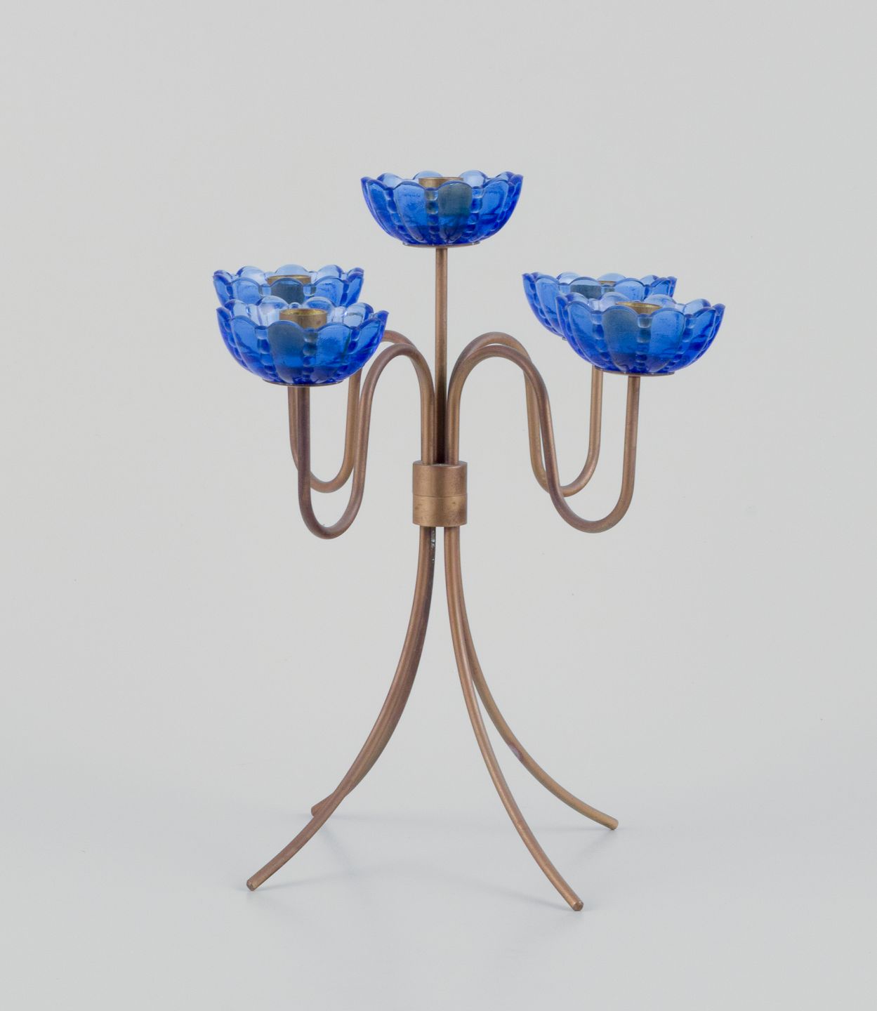 Gunnar Ander for Ystad Metall, Sverige. Høj lysestage i messing og blåt kunstglas formet som blomster. Til fem lys.1950'erne.