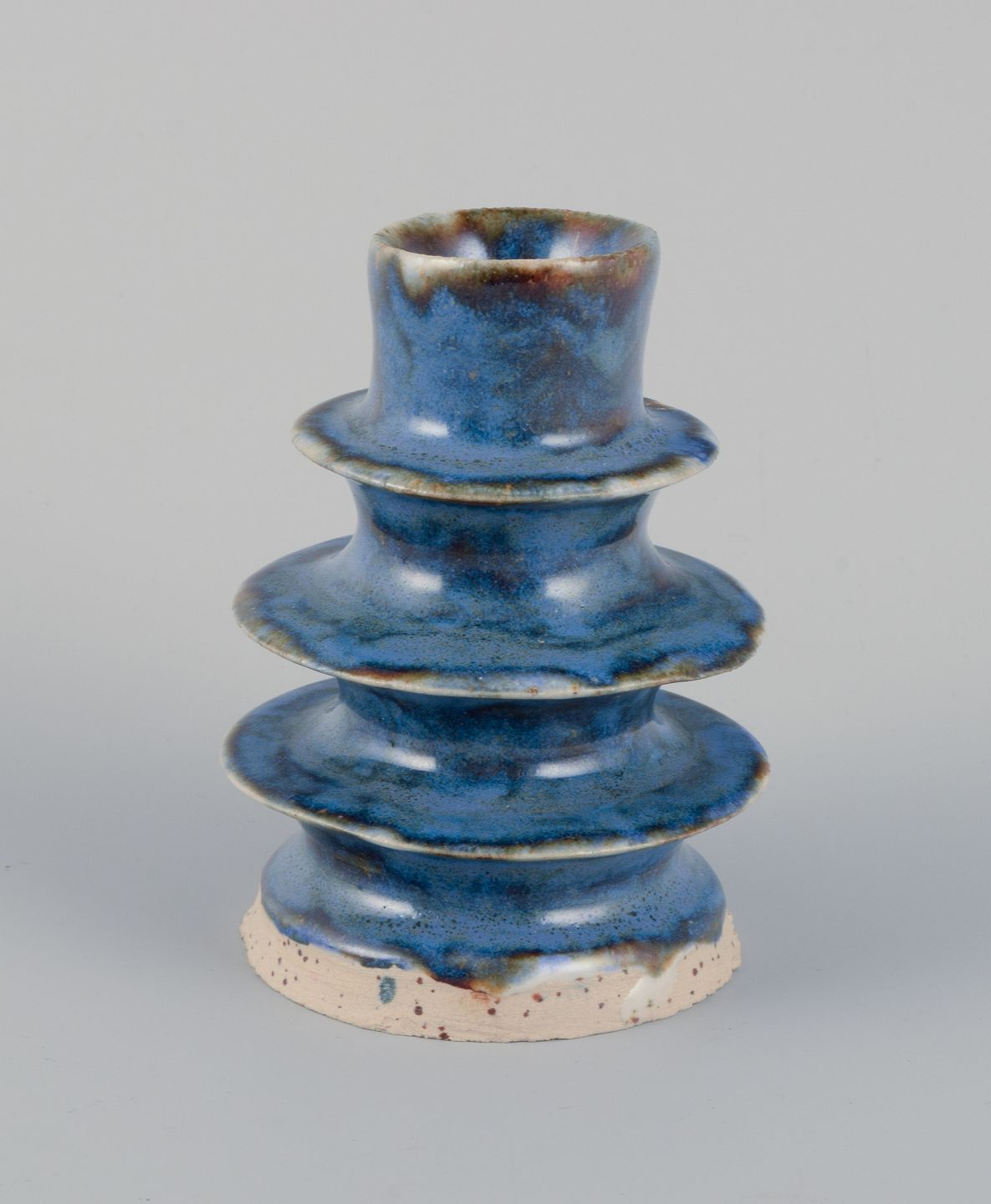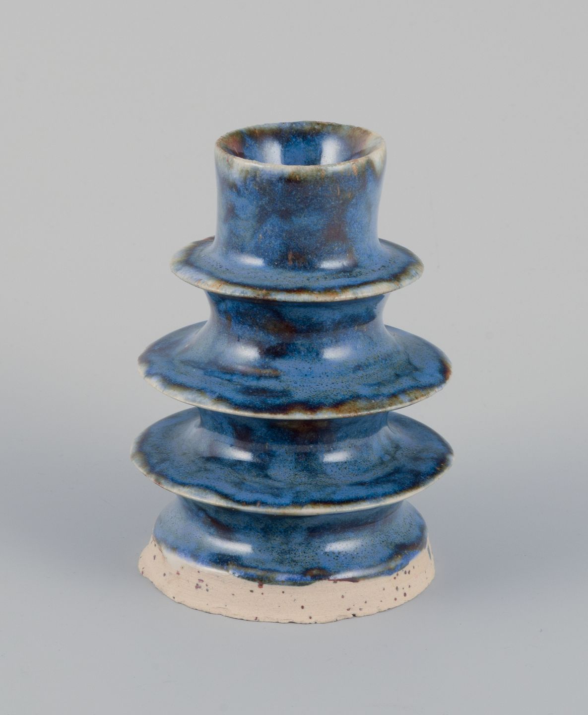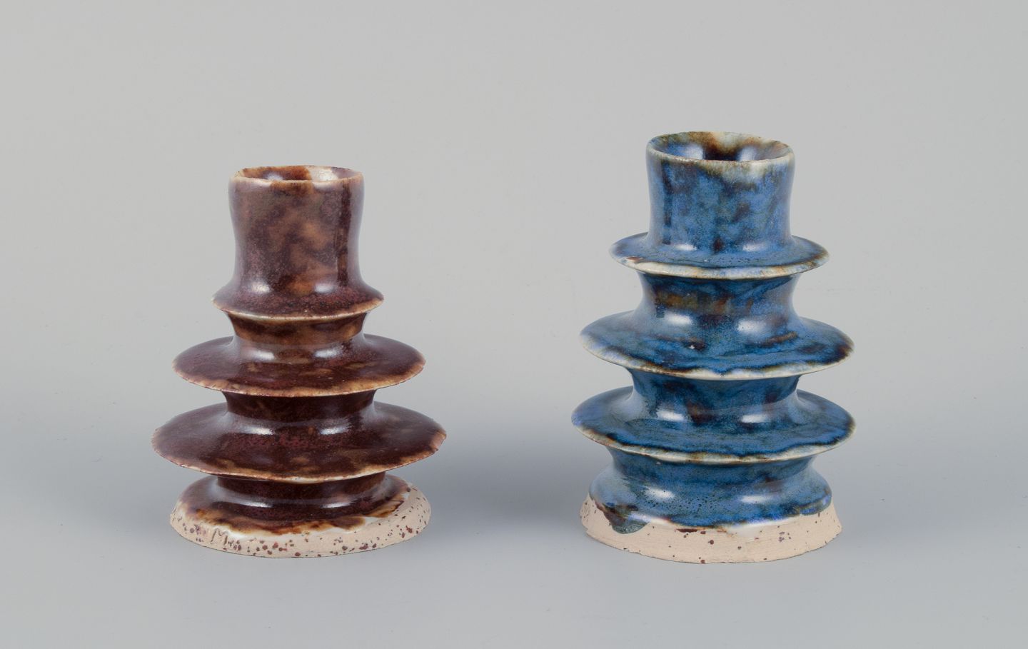 Europæisk studiokeramiker. To unika keramik lysestager. Glasur i blå og brune nuancer.Ca. 1980’erne.
