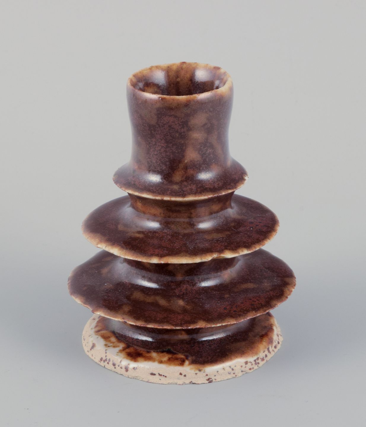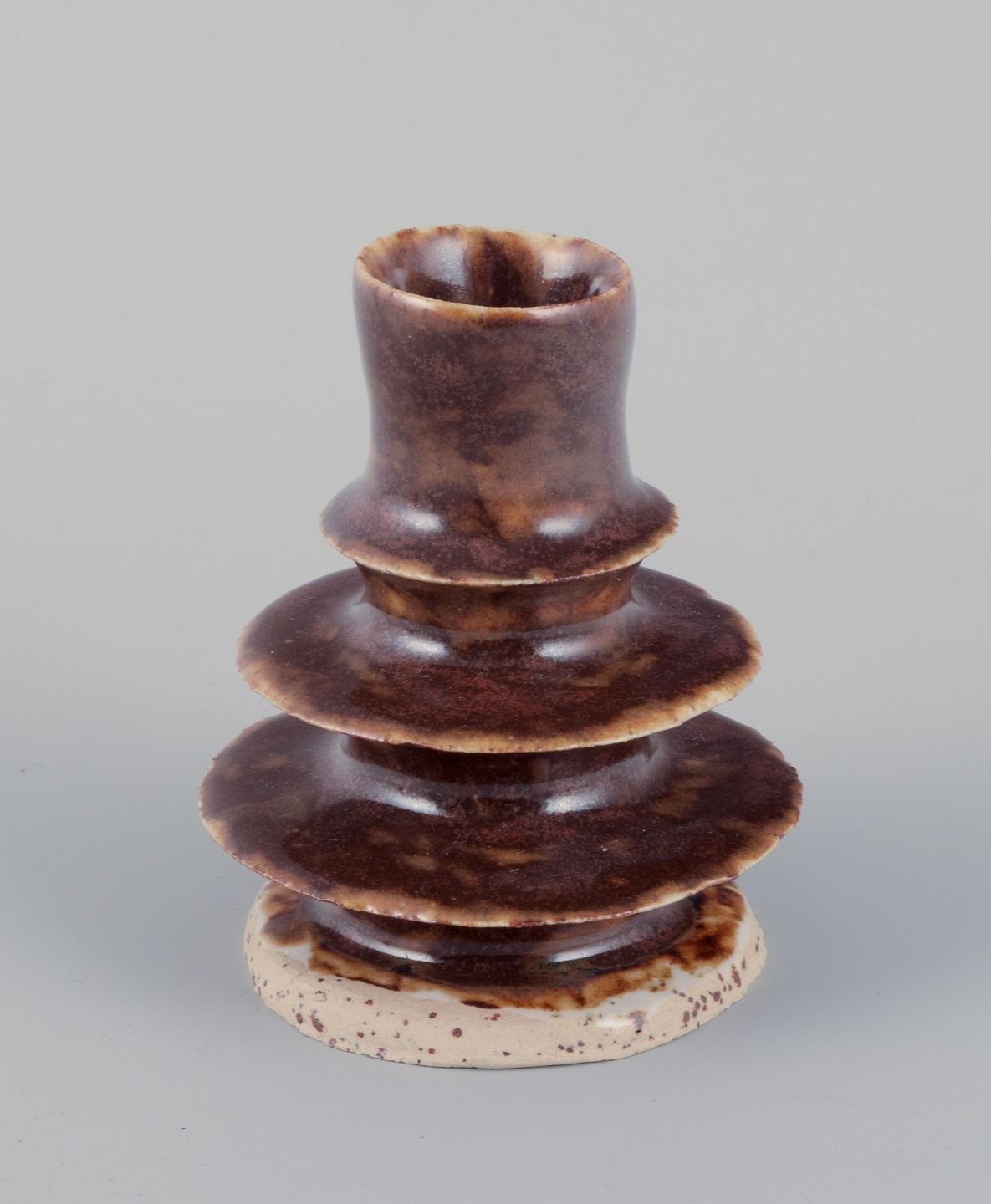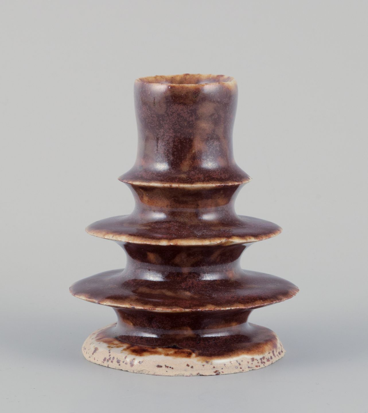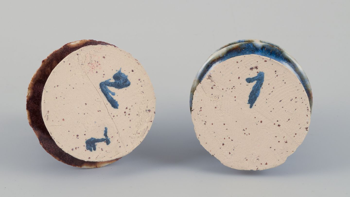 Europæisk studiokeramiker. To unika keramik lysestager. Glasur i blå og brune nuancer.Ca. 1980’erne.