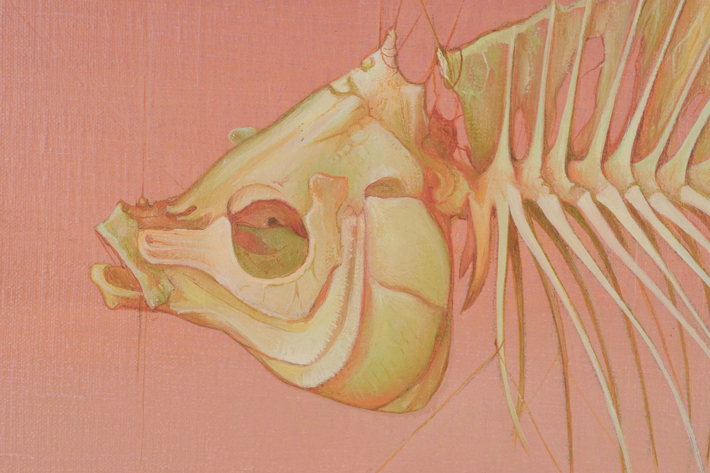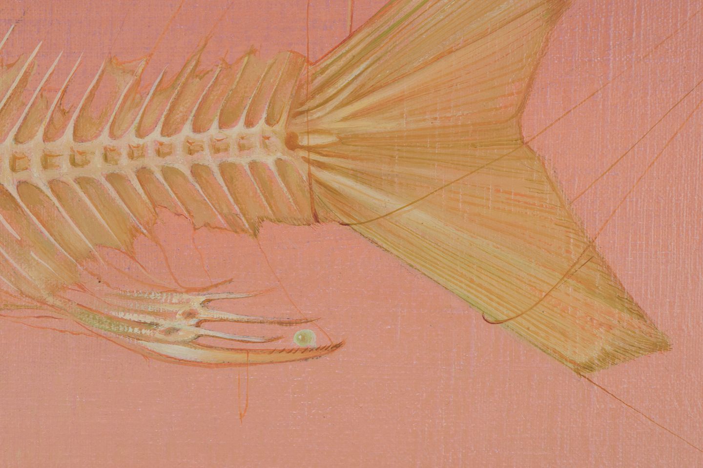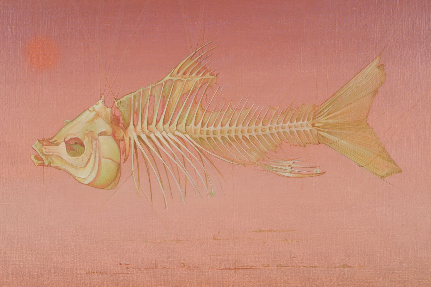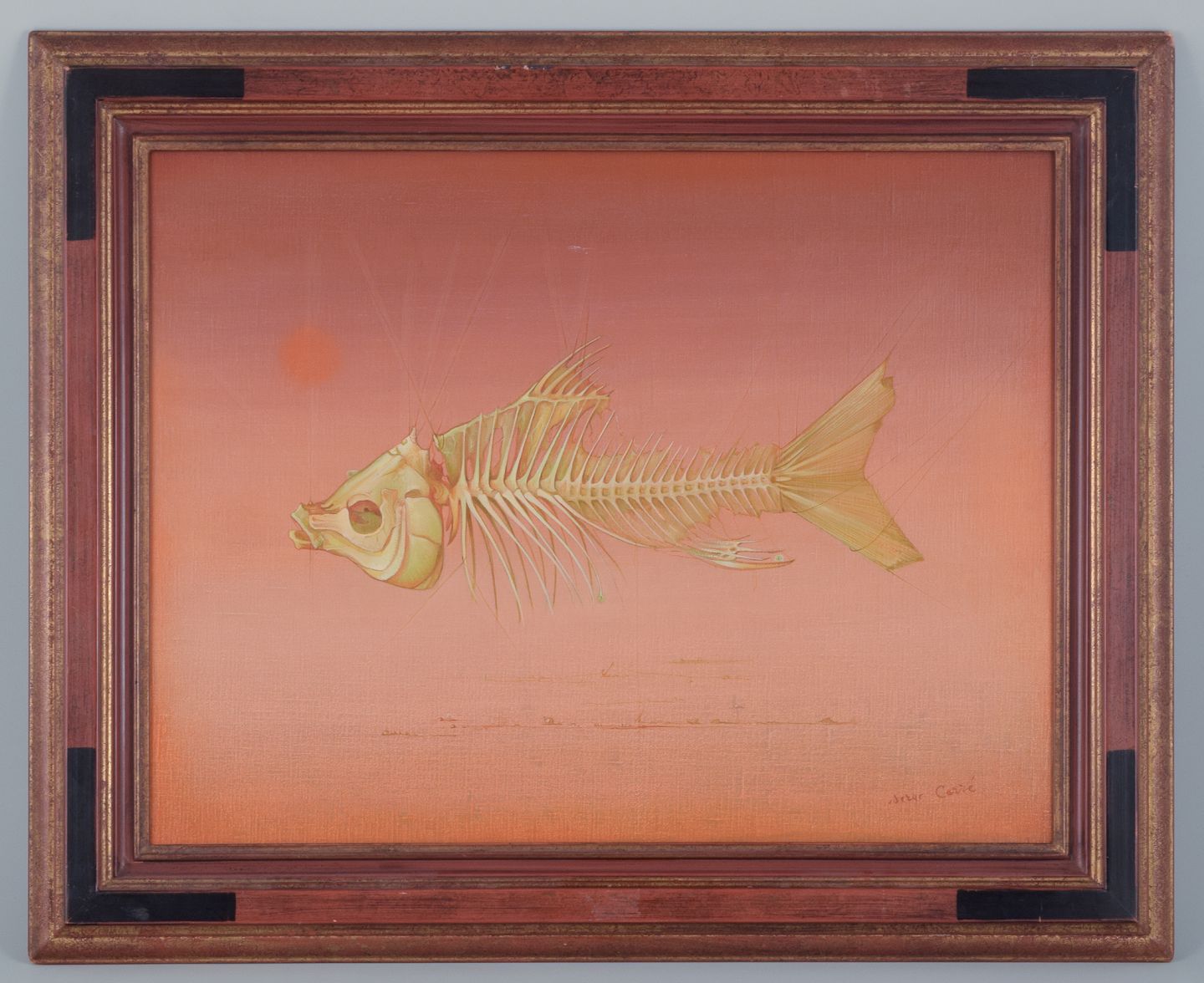 Serge Carre, fransk kunstner, olie på lærred.Surrealistisk opstilling med fiskeskelet.