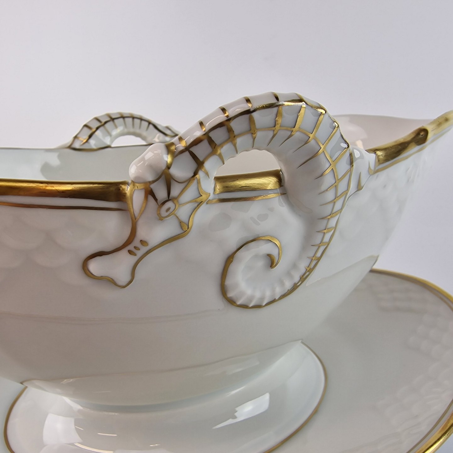 Åkjær er cremefarvet porcelæn med guldkant og mønster som ligner skæl