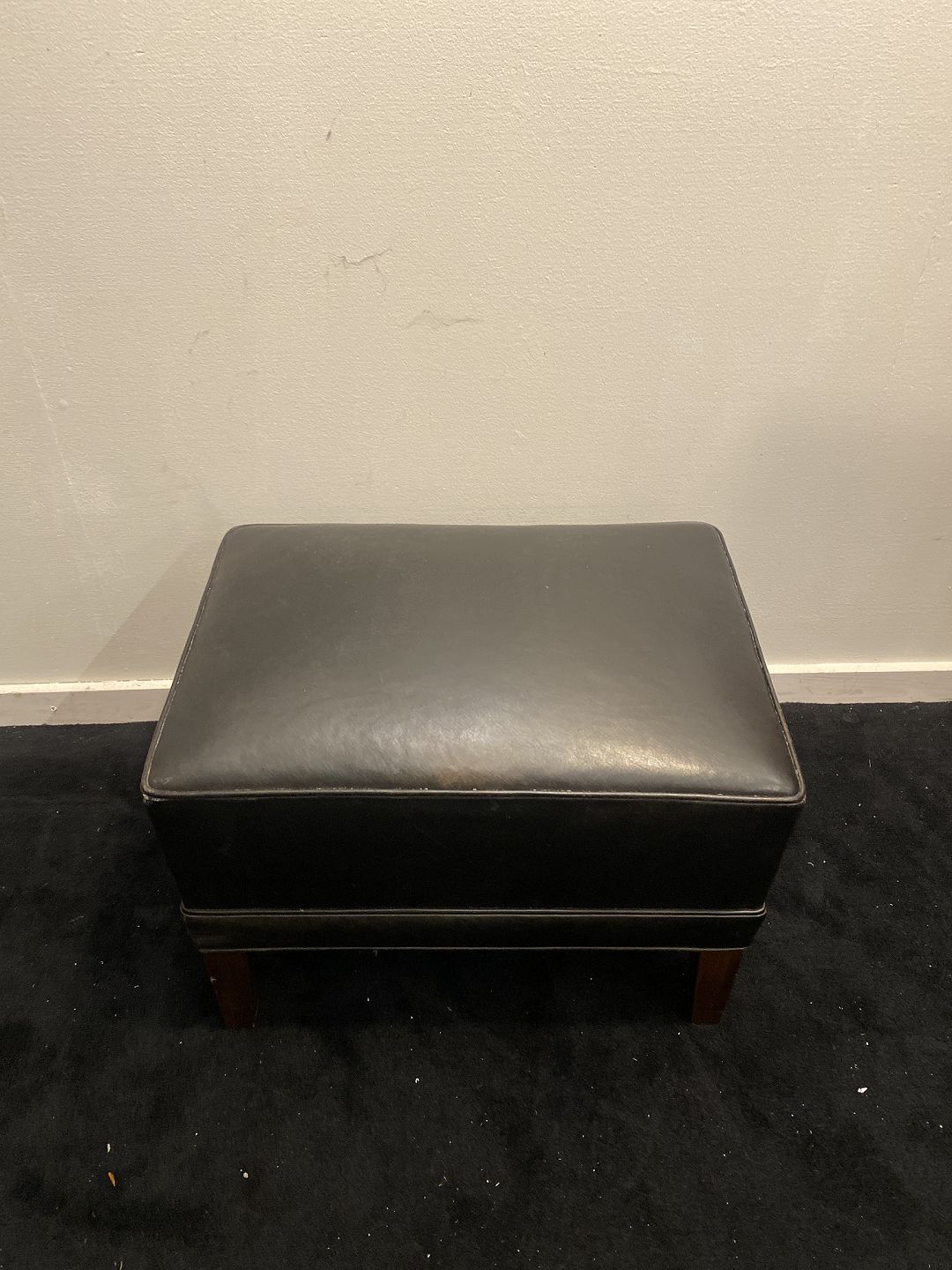 Fodskammel i sort læder og på mahogni ben. Fremstår pæn og velholdt uden nævneværdige brugsspor.