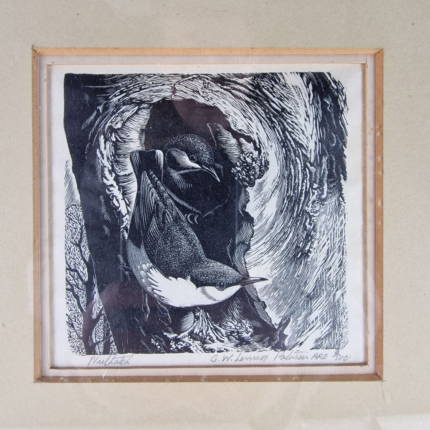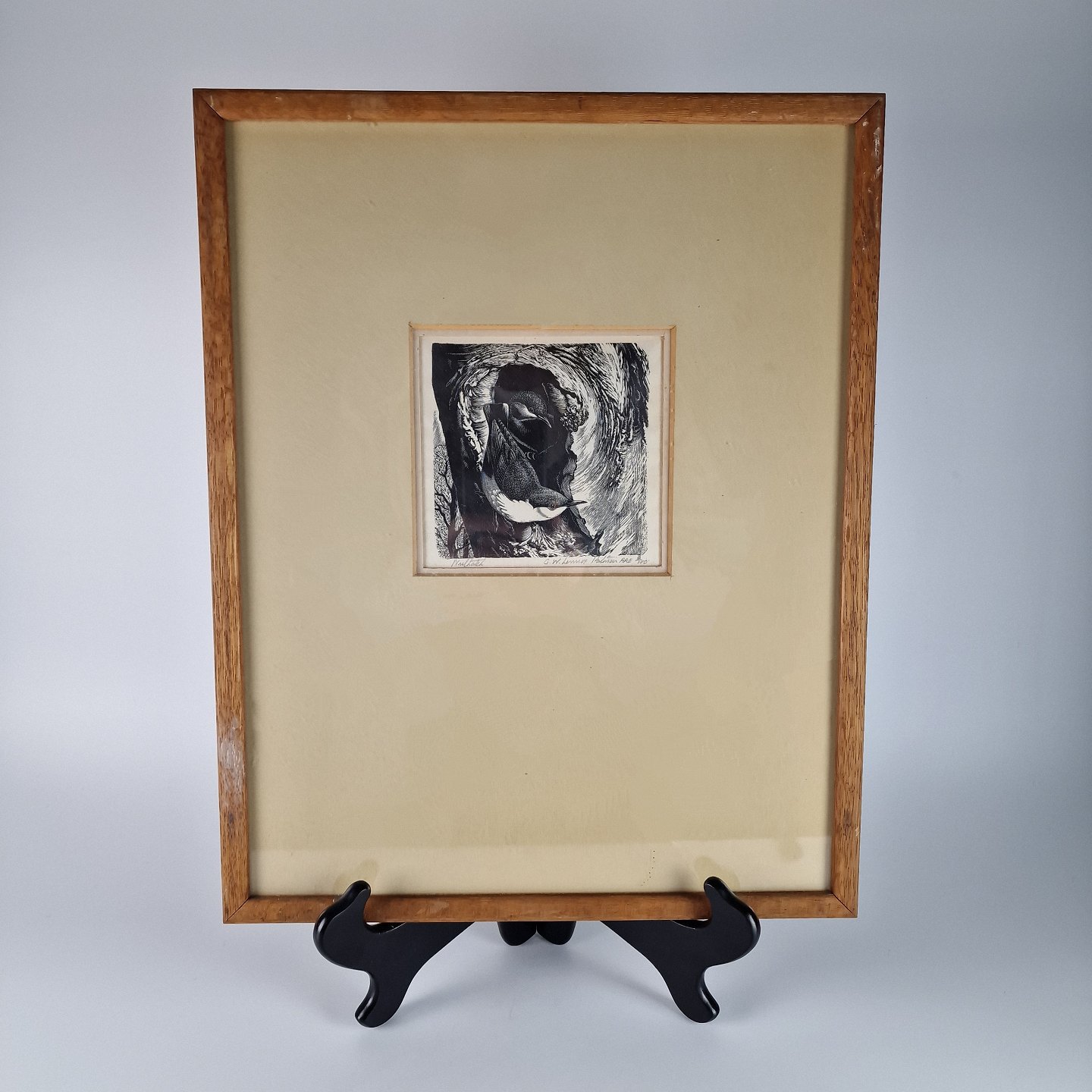 Radering med motiv af fugle, der sidder ved indgangen til deres rede i et træ. Titel Nuthatch (spætmejse)Kunstner Major G.W. Lennox Patterson, England (1915-1987)