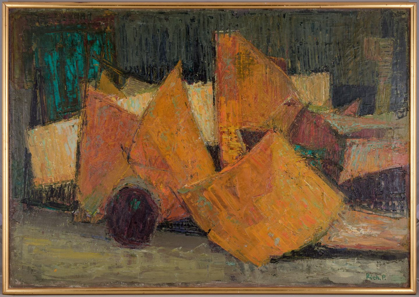 Richard Vilhelm Petersen (f. 1914), dansk kunstner. Olie på lærred.Abstrakt komposition.