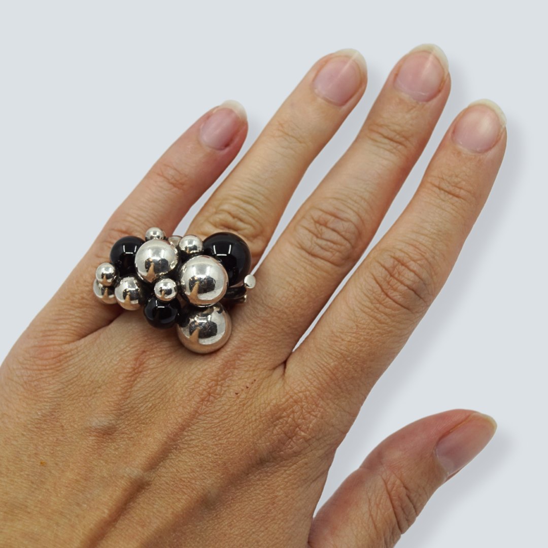 Georg Jensen; Stor Moonlight Grapes ring i sterlingsølv med sorte onyx kugler, large. Stemplet ring str. 50, men ringskinnen er justeret til at passe omkring str. 55-56. Stemplet "GJ 925 S 50".