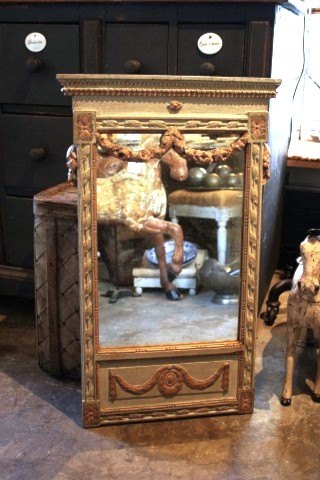 Svensk spejl i gustaviansk stil fra omkring år 1840 med fin dekoreret ramme i sart grå / grøn farve og med originalt spejlglas.H: 76cm. B:46cm.