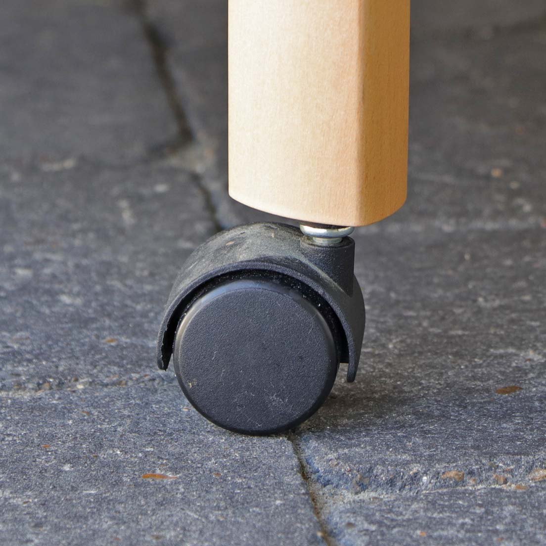 Trekantet bakkebord i lakeret bøgetræ med aftagelig topplade og sorte hjul i plastDesign Axel Christensen