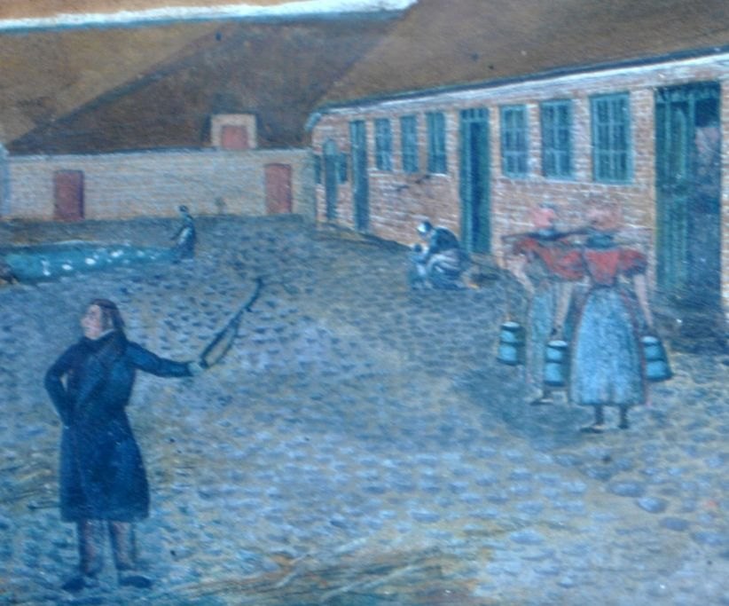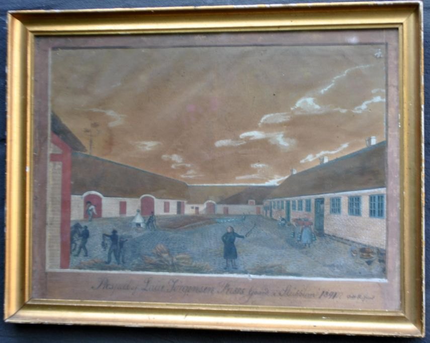 Dänischer Künstler (19. Jahrhundert): Prospekt des Bauernhofs von Laue Jørgensen Frise in Stubbum. 1841. Pastell auf Papier. Signiert: OMR 1841. 26 x 38 cm. Gerahmt: 32 x 42 cm. Einzigartige Quelle der lokalen Geschichte. Das Dorf Stubbum liegt etwas westlich von Christianfeld in Südjütland. Landwirt Laue Jørgensen Friis wurde am 2. September geboren. 1791 in Aller, Kreis Haderslev. Er heiratete Bodil Kirstine Lorentsdatter am 23. August 1817 in Aller. (MyHeritage).Bestellnummer: 26906
