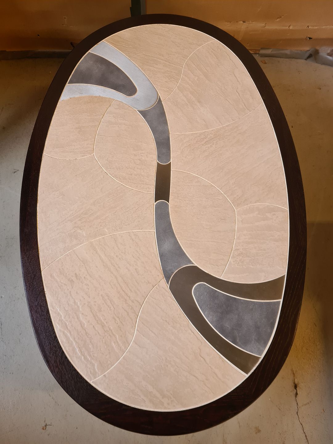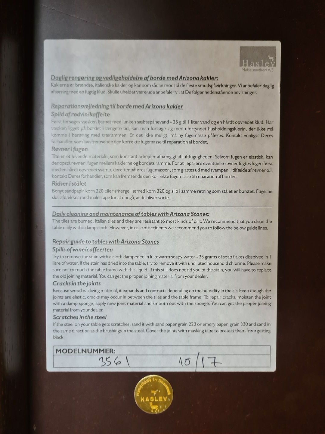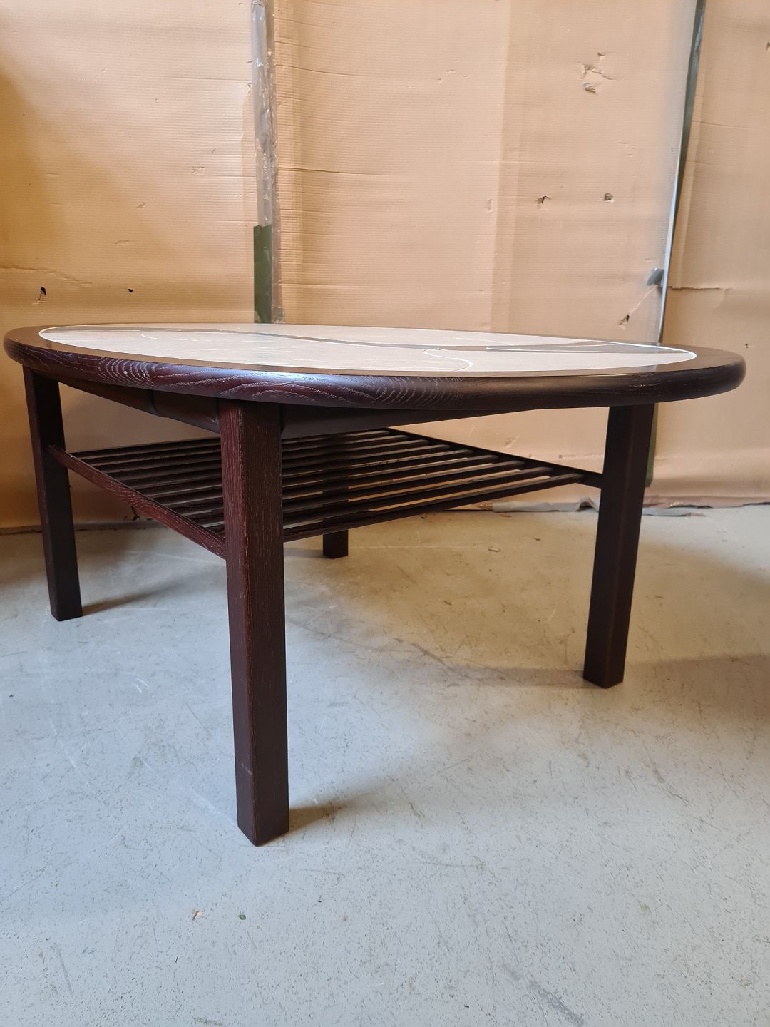 Haslev sofabord i bejdset egetræ og Arizonakakler, fra 2017.Det har små brugsspor.