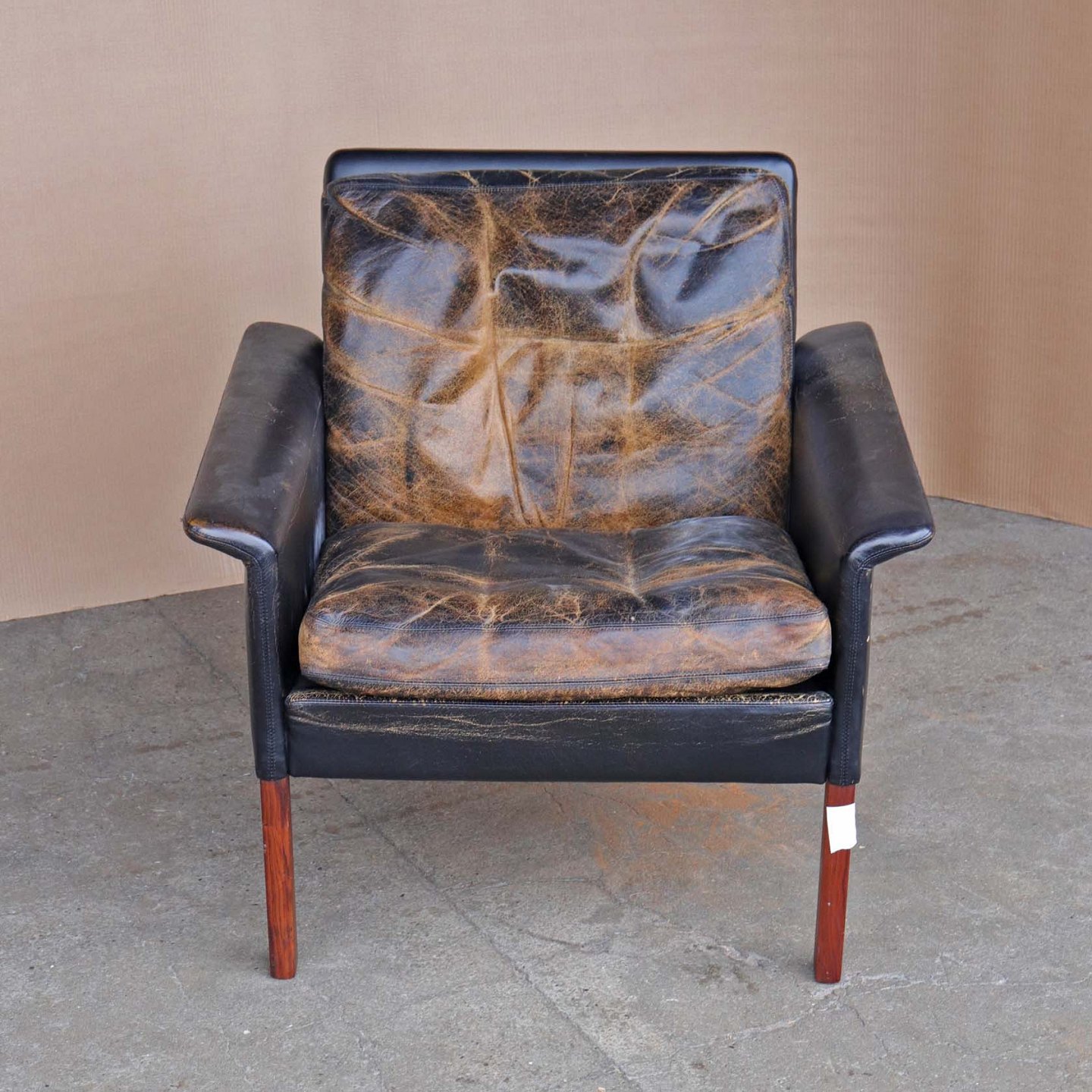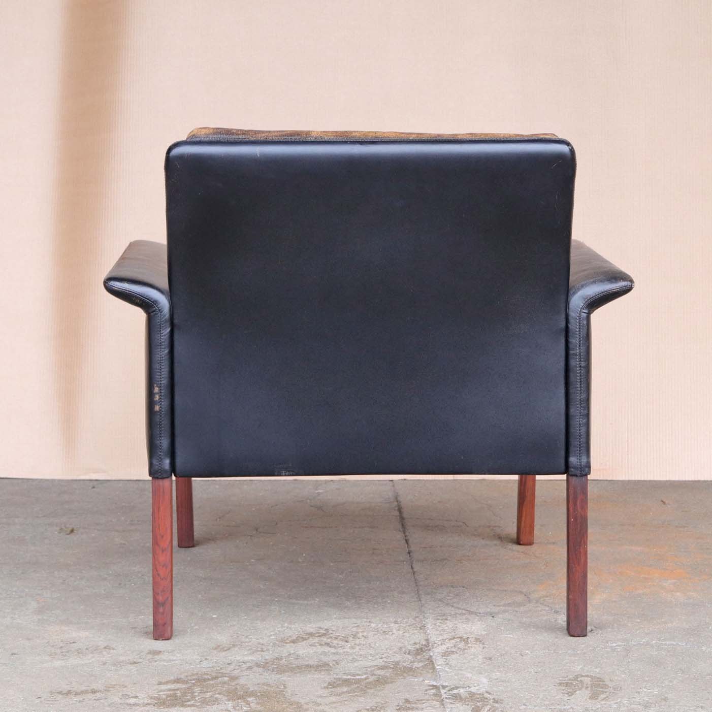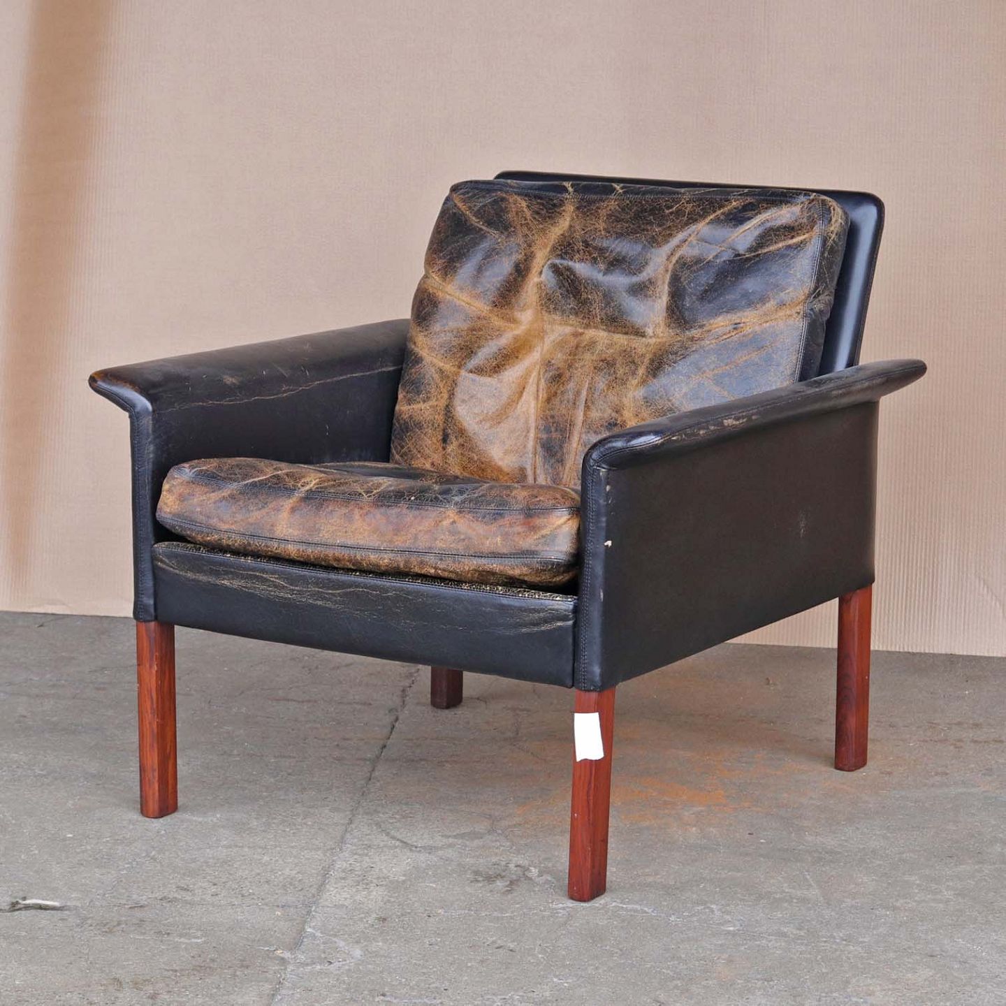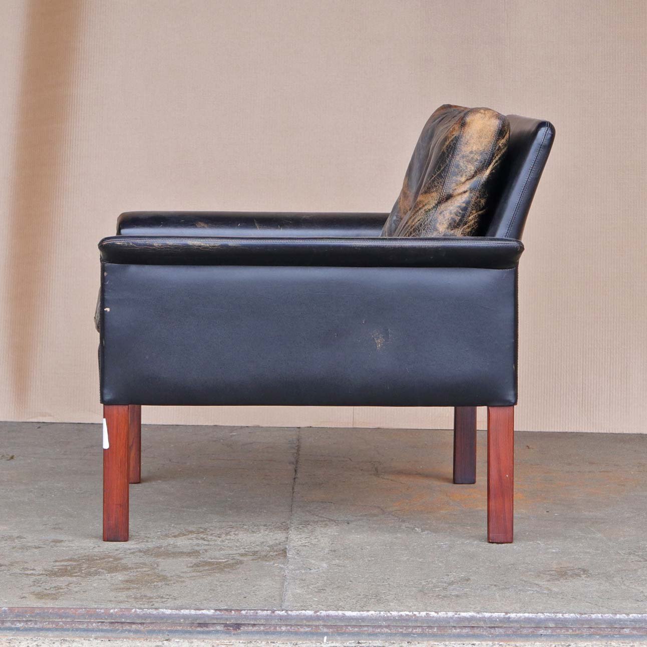 Lænestol med stel i lakeret palisander. Stolen betrukket med sort patineret læder Design Hans Olsen