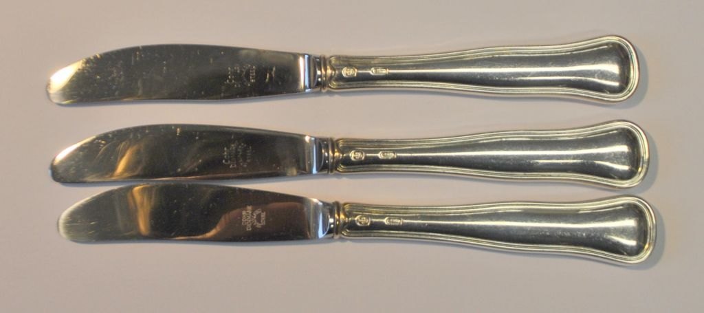 Doppelt geriffeltes Silberbesteck, unter anderem hergestellt von der Silberwarenfabrik Carl M. Cohrs, Fredericia, A/S, Dänemark. Horsens Silberwarenfabrik und Fredericia Silver, Fredericia. Tafelmesser mit Klinge aus Raadvad-Stahl, Länge: 22,5 cm. Preis pro Stück: 350,- DKK. 2 Stück auf Lager. Tafelmesser mit Klinge aus Raadvad-Stahl, Länge: 21,5 cm. Preis pro Stück: 350,- DKK. 5 Stück auf Lager. Mittagsmesser Horsens Sølvvarefabrik, Länge: 20,5 cm. Preis pro Stück. 350,- DKK. 12 auf Lager. Tortenmesser mit Wetzstahl, Horsens Sølvvarefabrik, Länge: 24 cm. Preis: 450,- DKK (VERKAUFT) Bitte fragen Sie nach weiteren Teilen!Bestellnummer: 1684