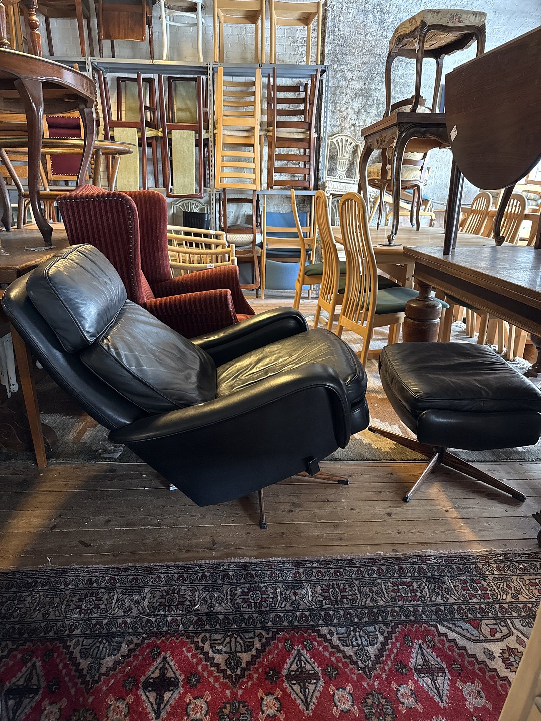 Læder lænestol med fodskammel, fra 1990erne.Den har brugsspor og vippe funktion.