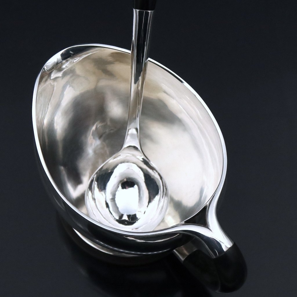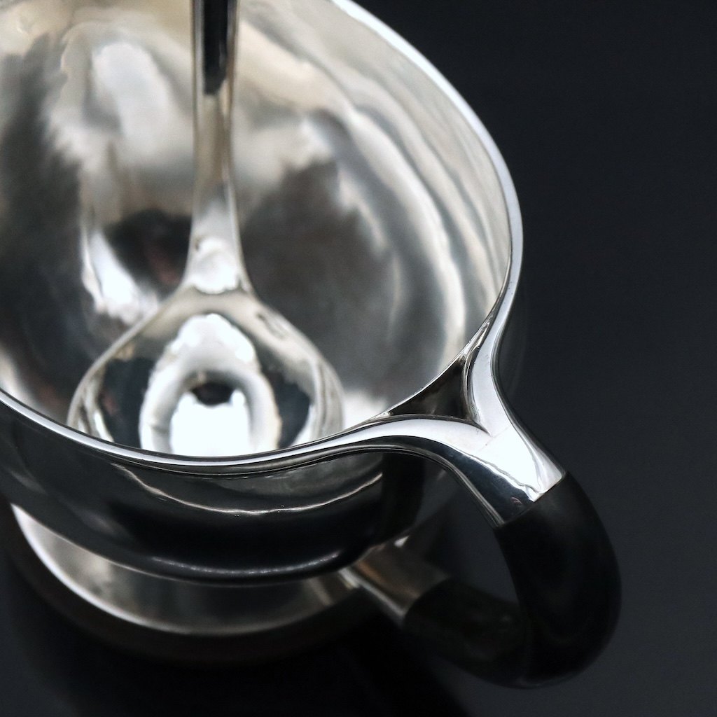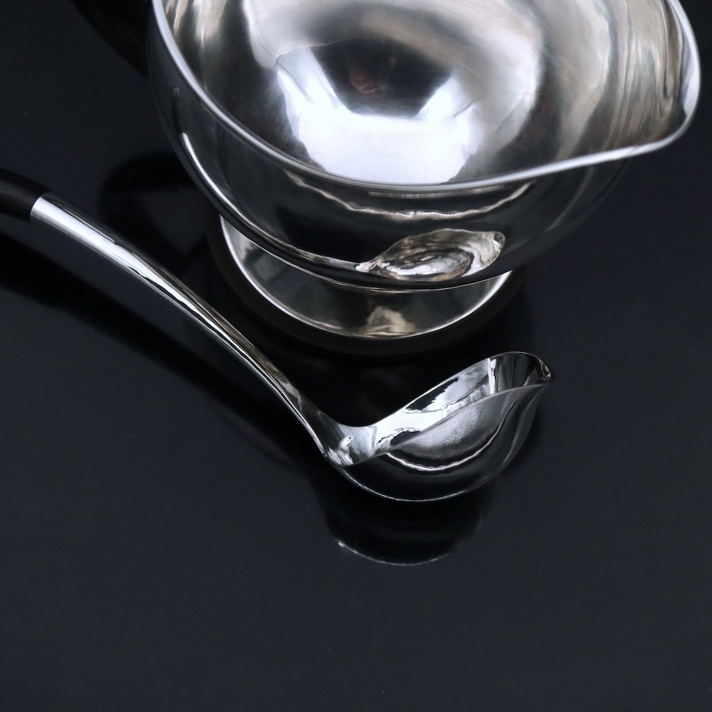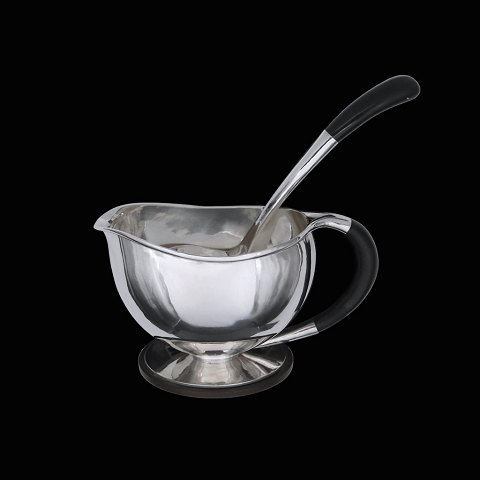 Aage Weimar. Art deco saucekande i sterling sølv med tilhørende ske.Fod og greb i ebonit.