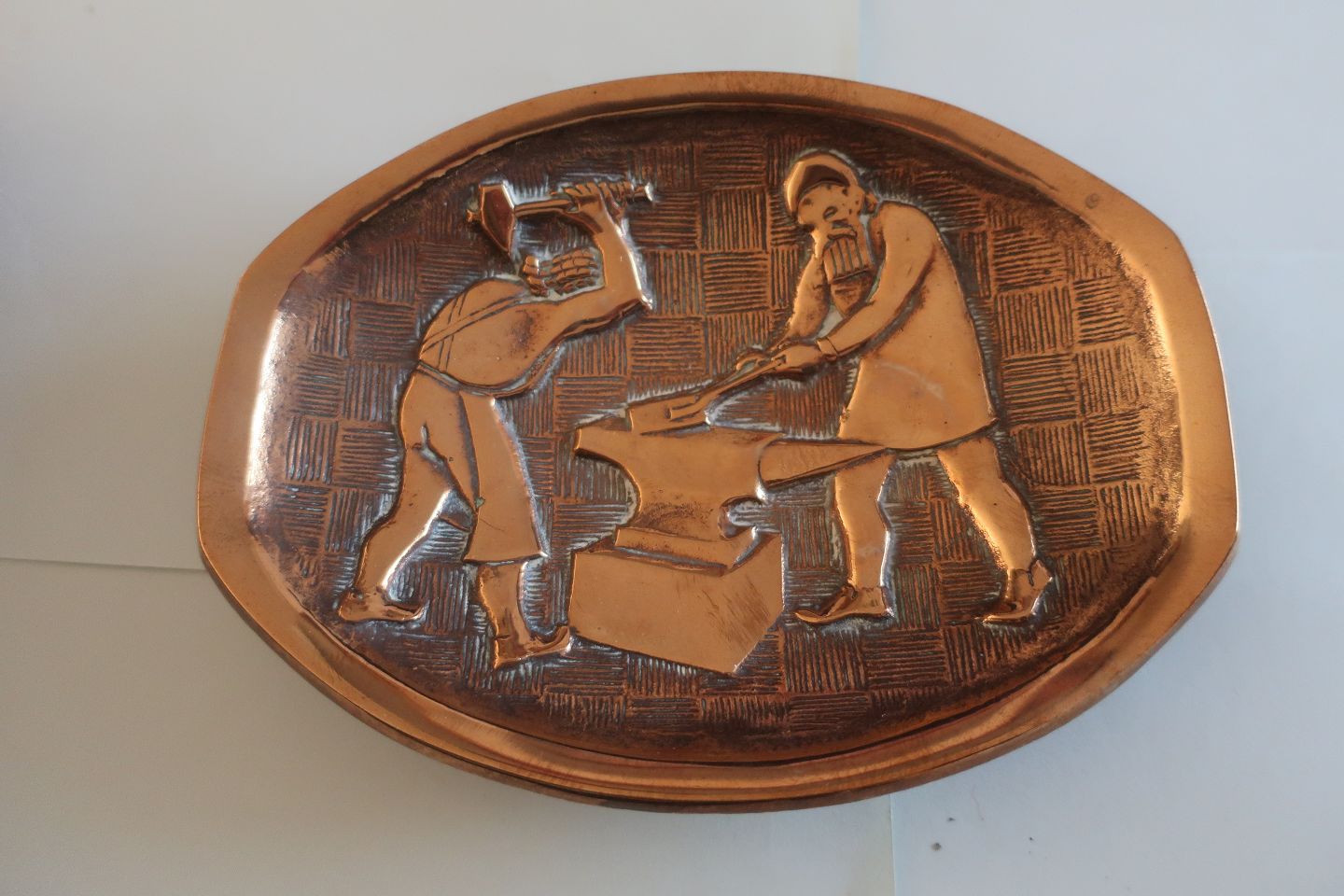 Oval platte/fad/lille skål i ædelmetal (messing)Relief illustreret som 2 smede i arbejde