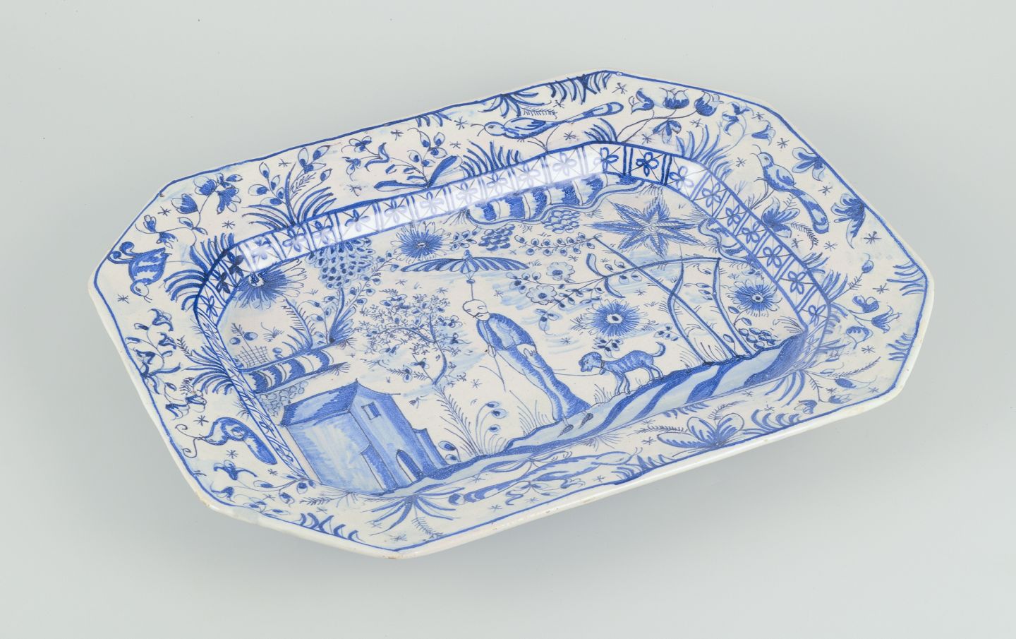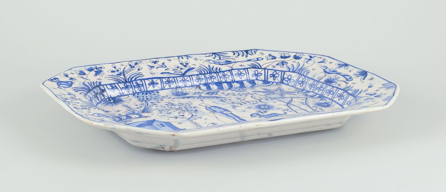 Europæisk keramikfad, ottekantet.Håndmalet motiv, gående mand med hund.