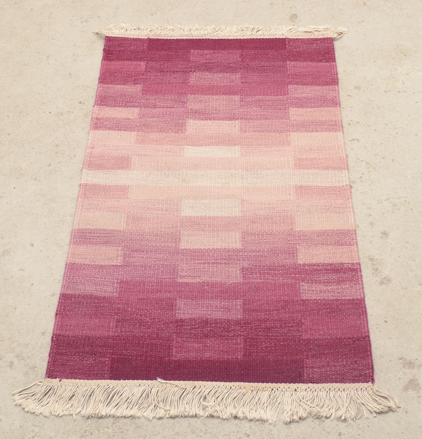 Vævet med geometriske felter i rødlige og violette toner.