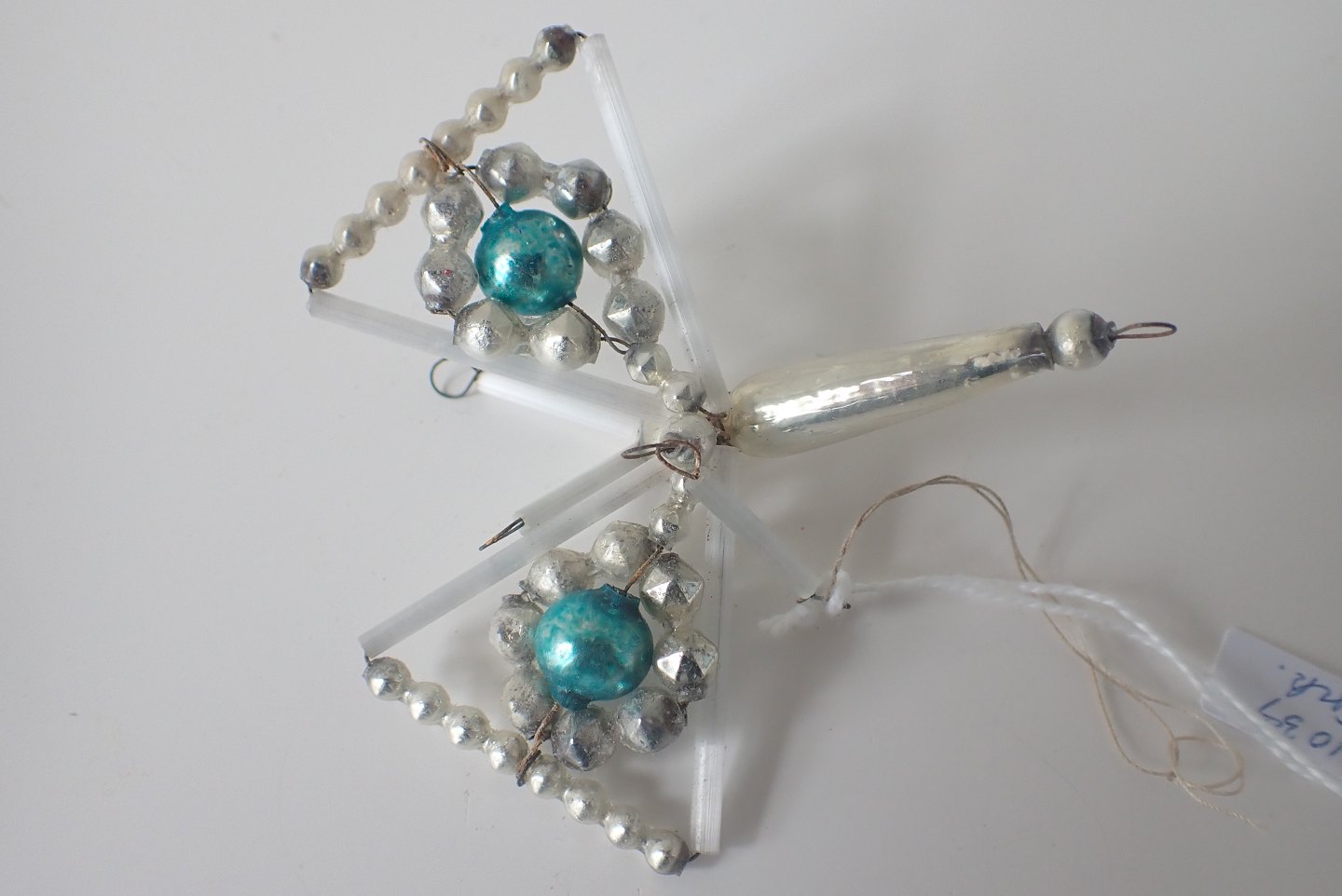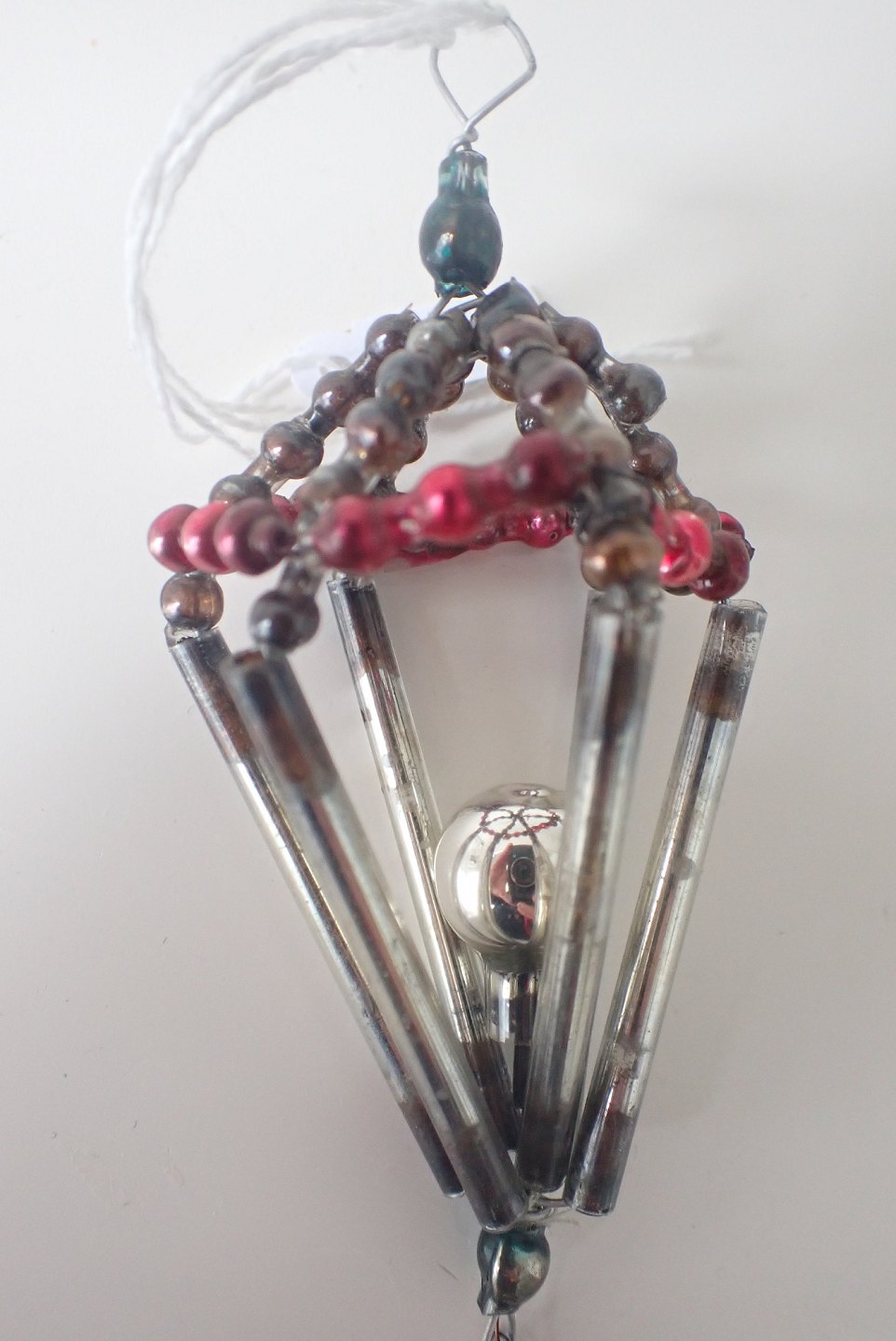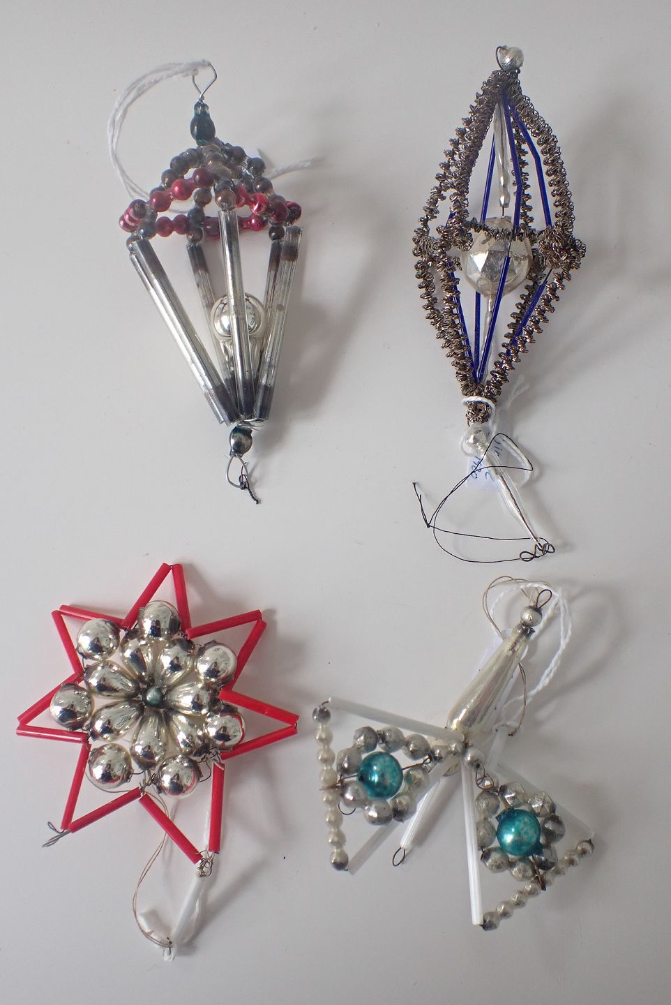 4 stk. sammensatte glasjulepynt fra Tyskland.Øverst til venstre: Lygte sammensat af glasperler/-kugle og -stænger. 1930 - 1940. Højde: 8,5 cm. Pris: 250 kr.