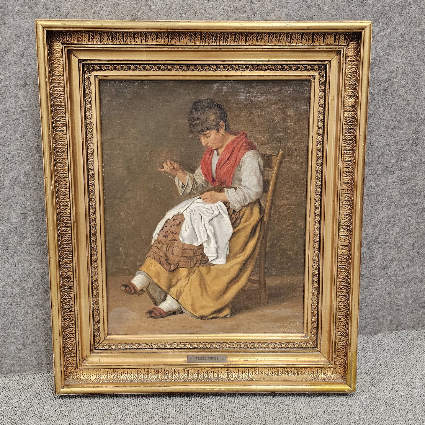 Oliemaleri på lærred med guldmalet ramme.Motiv af en kvinde som sidder og syer.