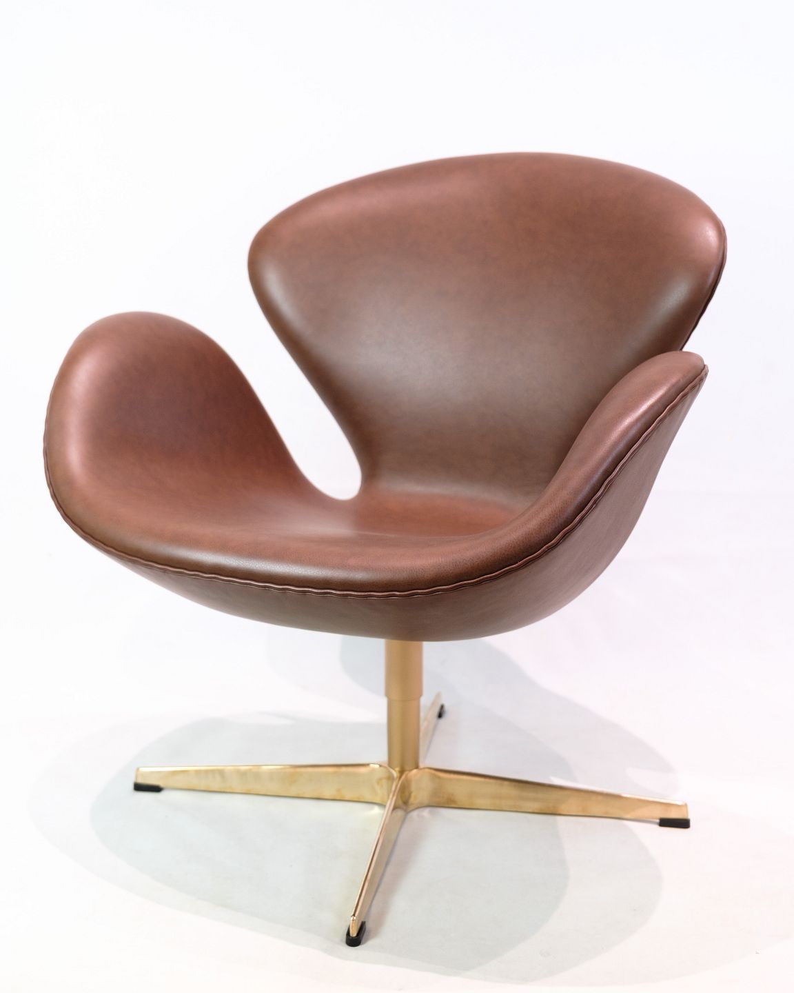Svanen, model 3320 fremstillet af Fritz Hansen og designet af Arne Jacobsen. Den er polstret med brunt læder af høj kvalitet og har en orignal 60 års jubilæums guld søjle. Står i meget flot stand.Mål i cm: H:76 B:75 D:46 SH:40