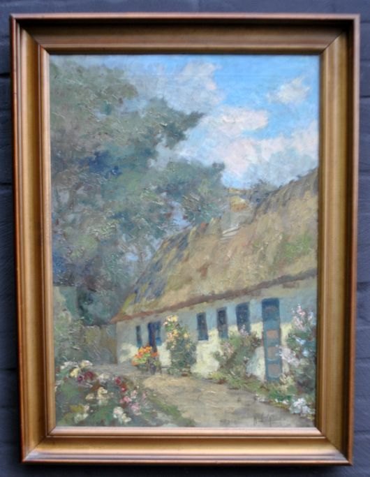 Pedersen, Hugo V. (1870 - 1959) Dänemark: Blumen vor einem Haus. Öl auf Leinwand. Unterzeichnet. 69 x 50 cm.