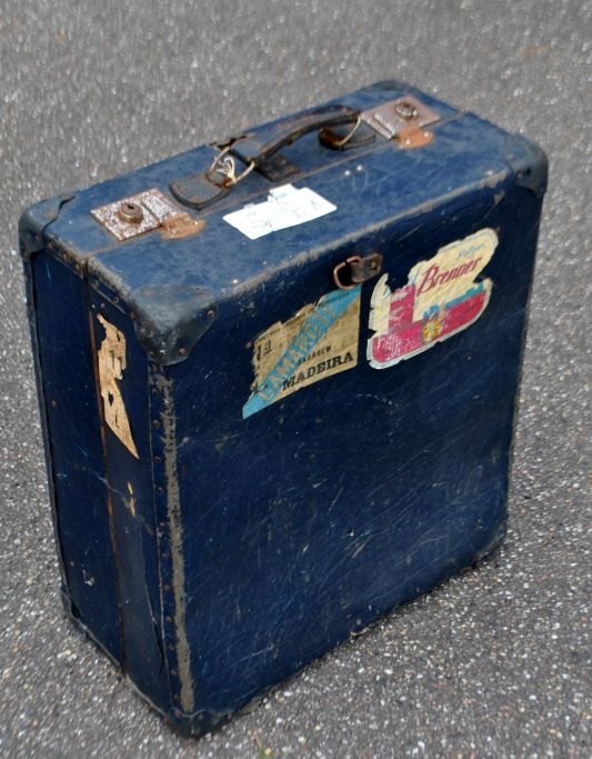 Koffer, 20. Jahrhundert. Mit deutschen Etiketten. Breiter Griff. Zwei Schlösser, rostig und ohne Schlüssel. L: 54 cm. B: 49 cm. H: 26 cm.Bestellnummer: 28004