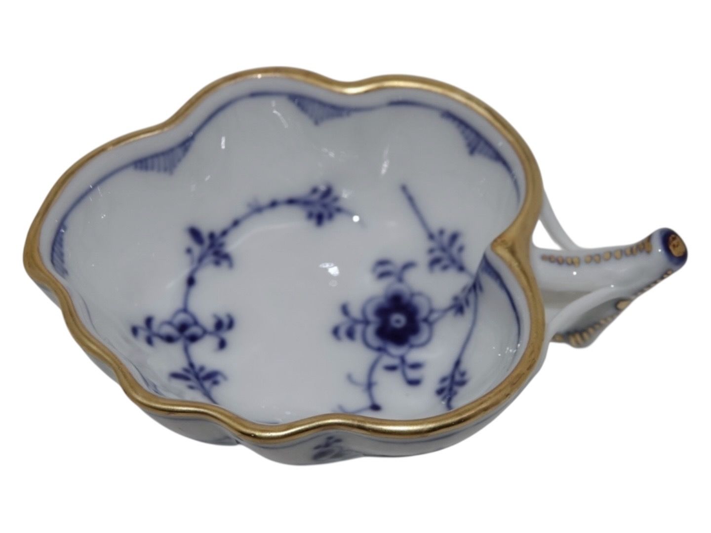 Royal Copenhagen Musselmalet Riflet med guldkant, sjælden lille skål med hank.Stemplerne viser, at denne er produceret mellem 1898 og 1923.