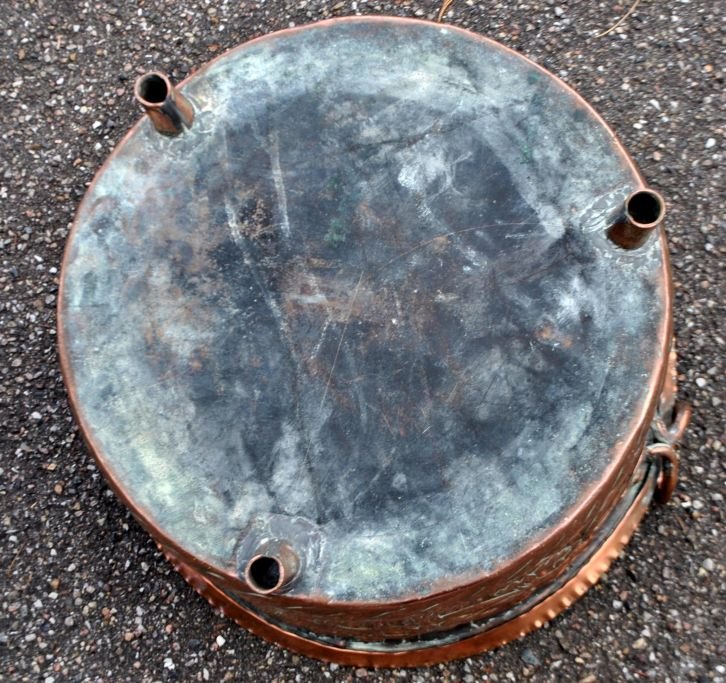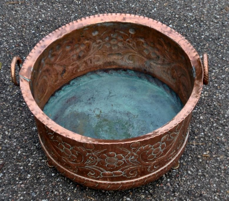 Brennholzeimer, Haraldskjær Kupferfabrik, Vejle, 19. Jahrhundert. Dänemark. Mit drei Beinen und zwei Griffen. Mit aufwendig getriebenen Verzierungen an der Seite. H.: 29 cm. Durchmesser: 40 cm. Perfekter Zustand!Bestellnummer: 28028